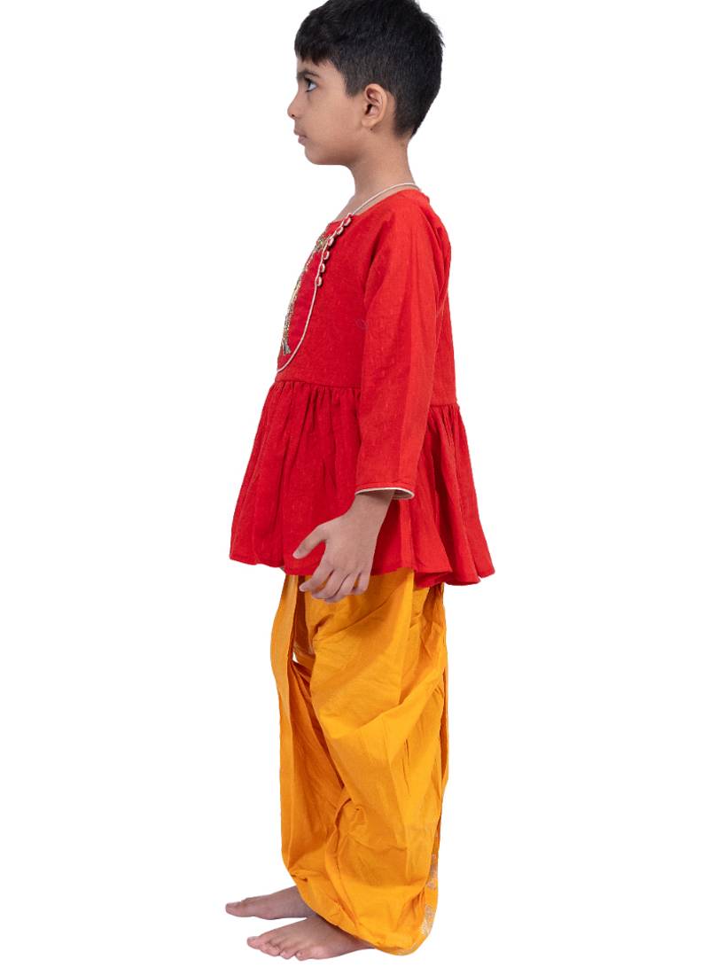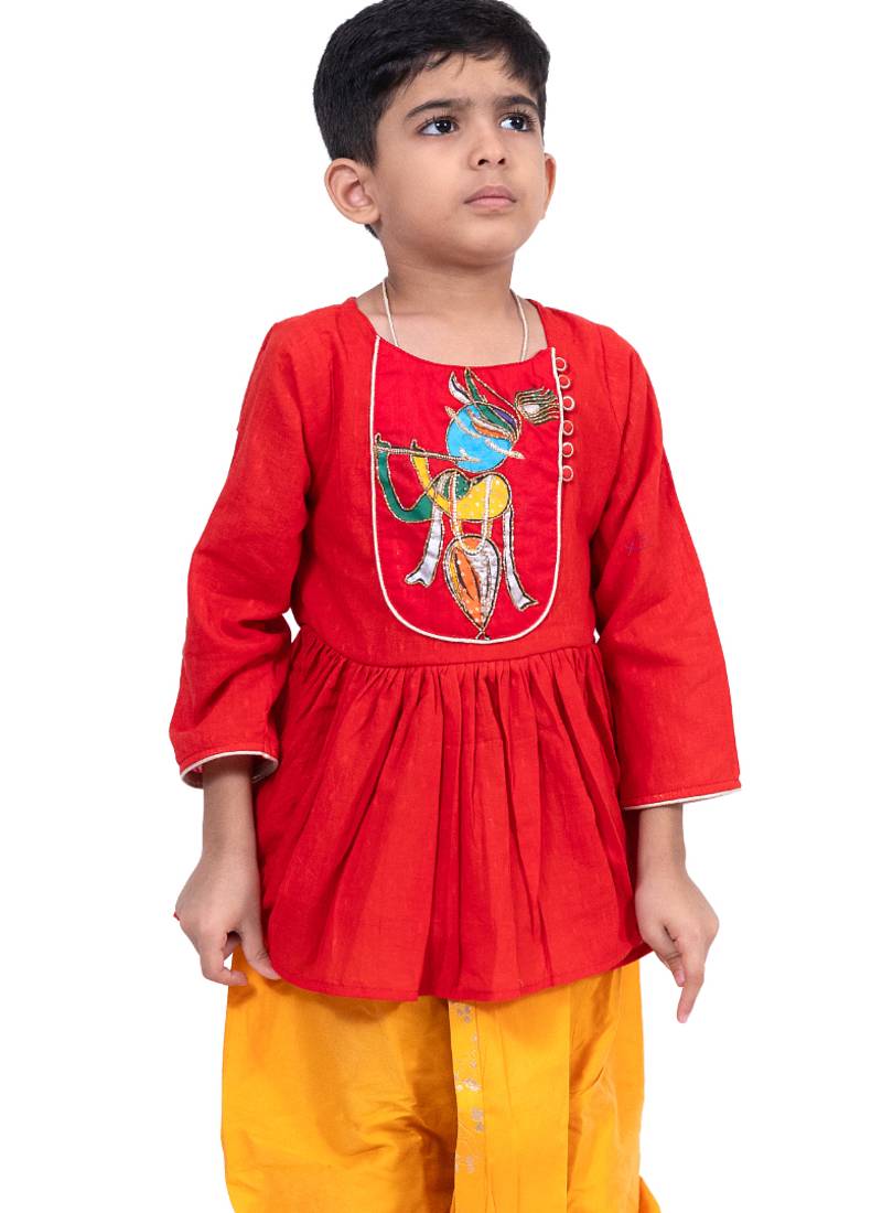 Cotton 3::4sleeves krishna printed kurta with dhoti - red & yellow