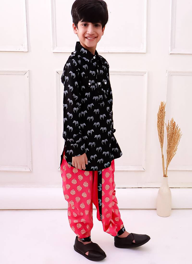 | Product Name | Rayon Fullsleeves Zebra Printed Kurta With Dhoti Black & Coral | |