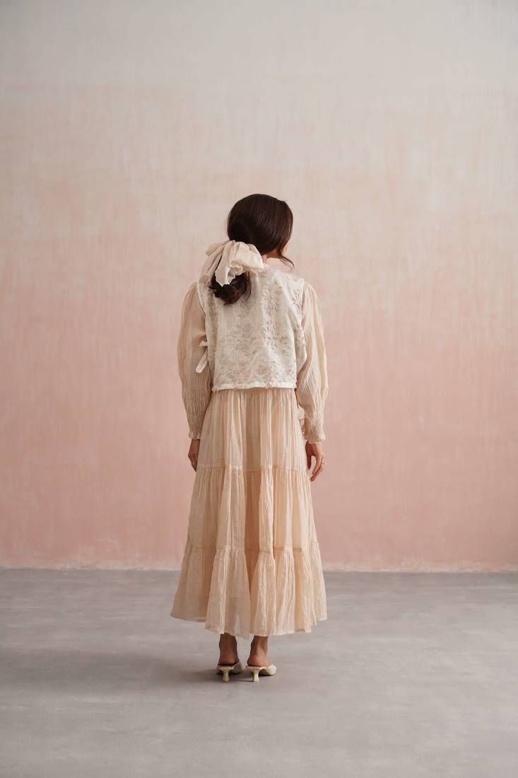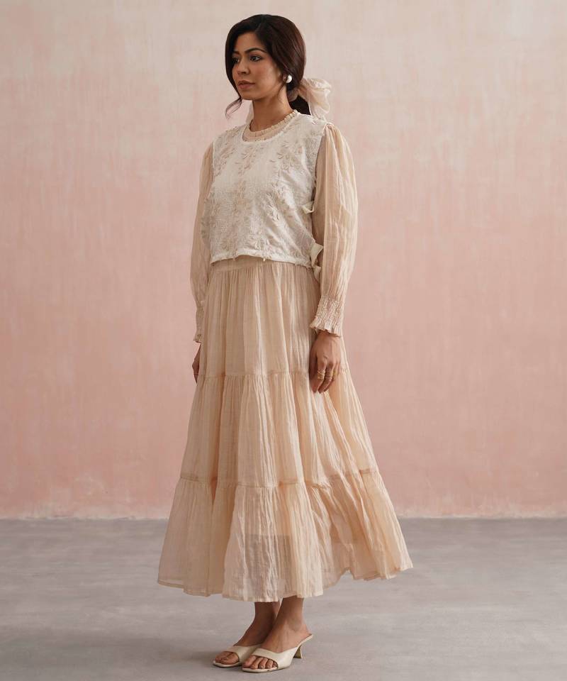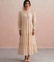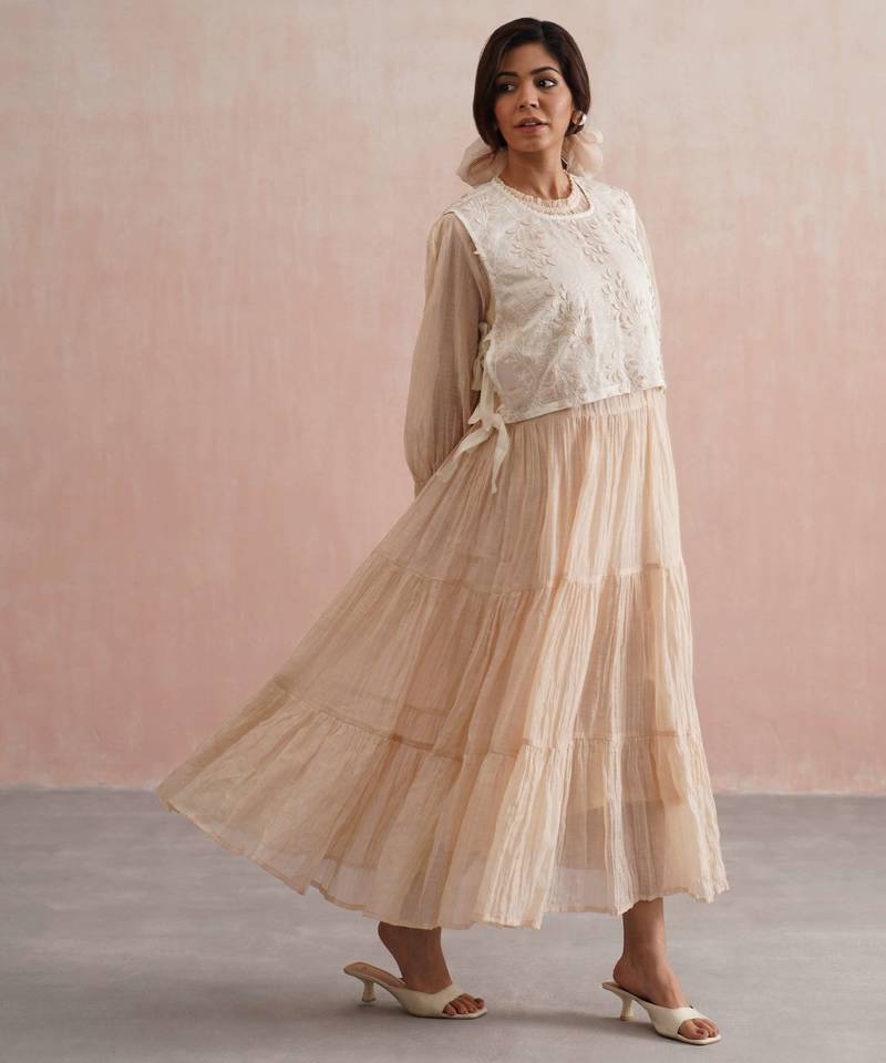 | Product Description | A Graceful Ankle Length Tiered Dress Crafted In Soft Beige Mul Chanderi, Designed To Flow Effortlessly With Every Step. The Full Length Sleeves Feature Intricately Smocked Cuffs, Delicately Adorned With Fine Pearls Adding Just The Right Touch Of Understated Sparkle.