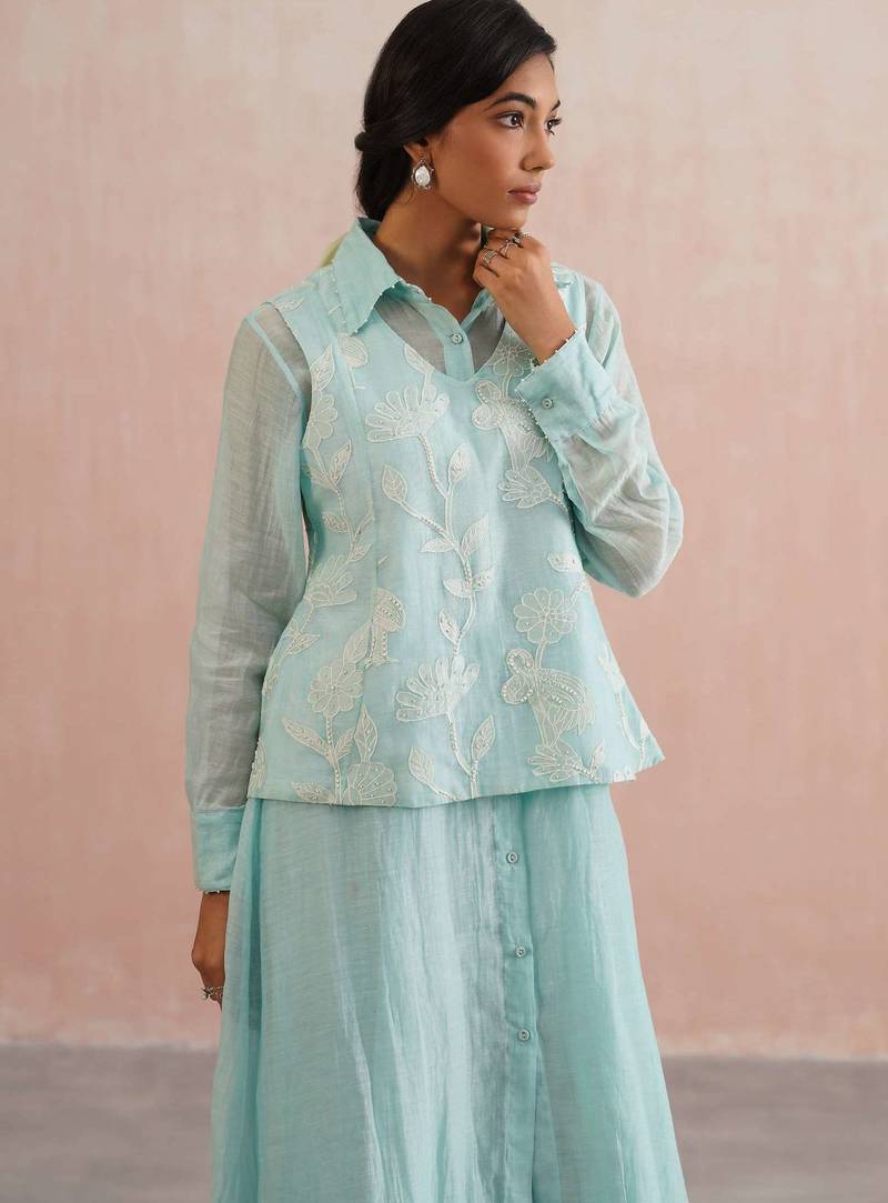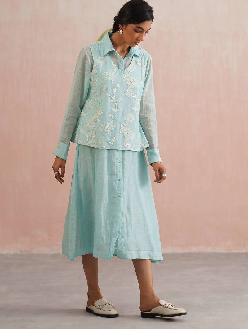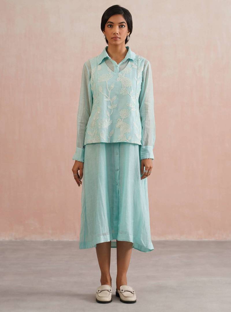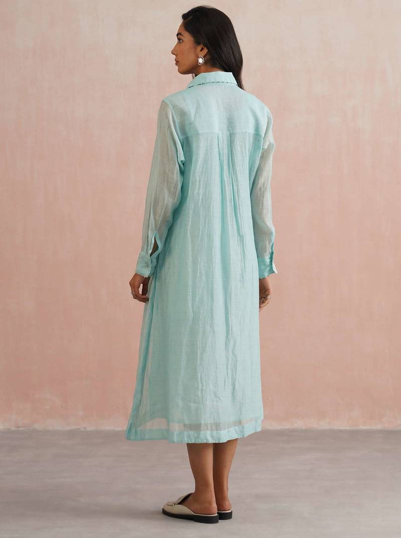 | Product Description | This Elegant Pastel Pale Blue Shirt Dress Is Crafted In Breathable Pure Mul Chanderi, Ideal For Warm Weather Dressing. Featuring A Classic Front Button Placket And Delicate Pearl Detailing At The Collar And Cuffs, It Effortlessly Blends Sophistication With Comfort.