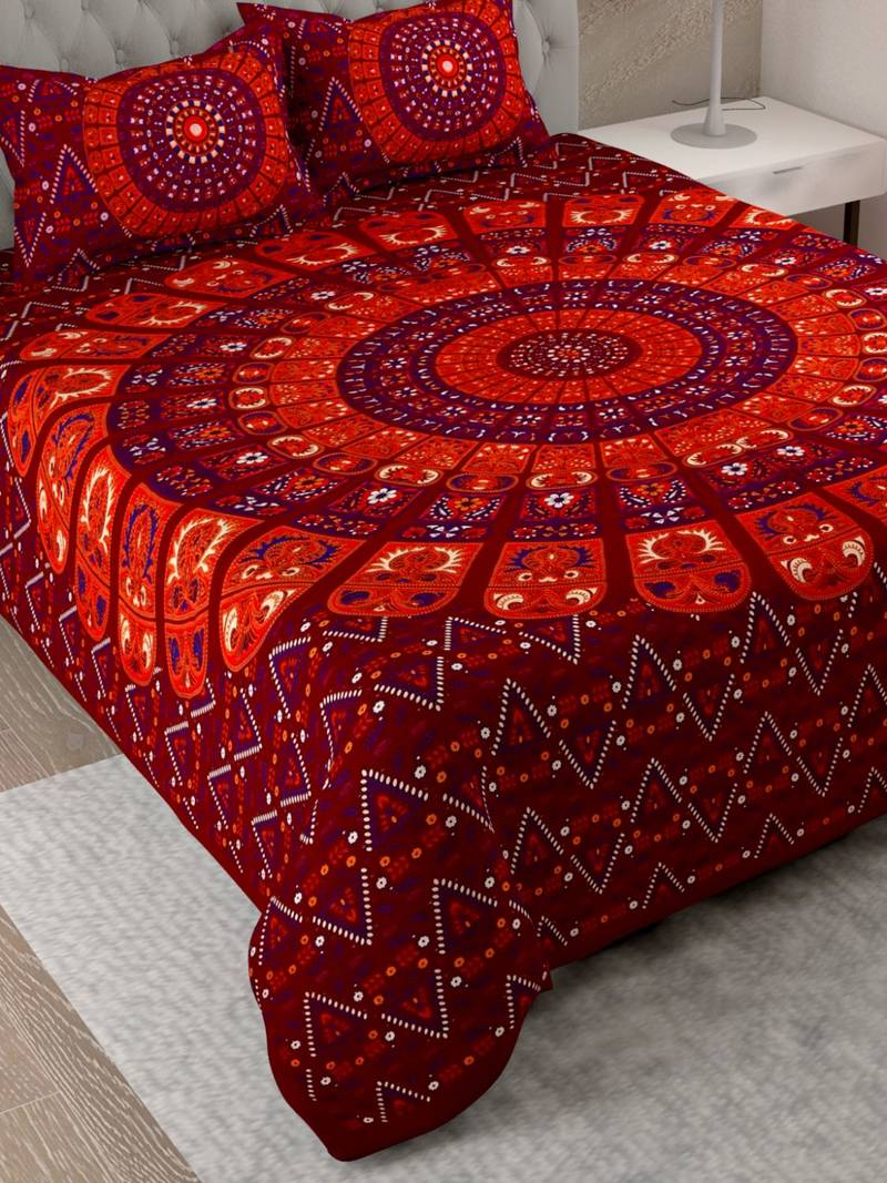 Uniqchoice maroon color 100% cotton badmeri printed king size bedsheet with 2 pillow cover(d-1047nmaroon)