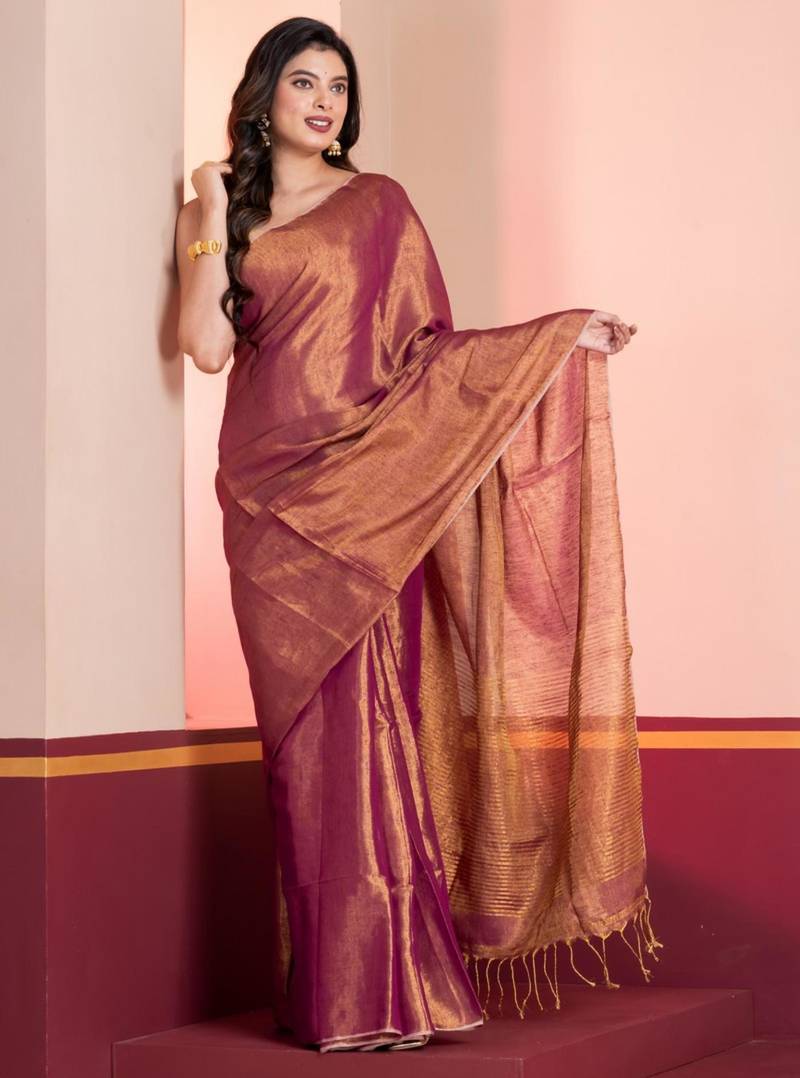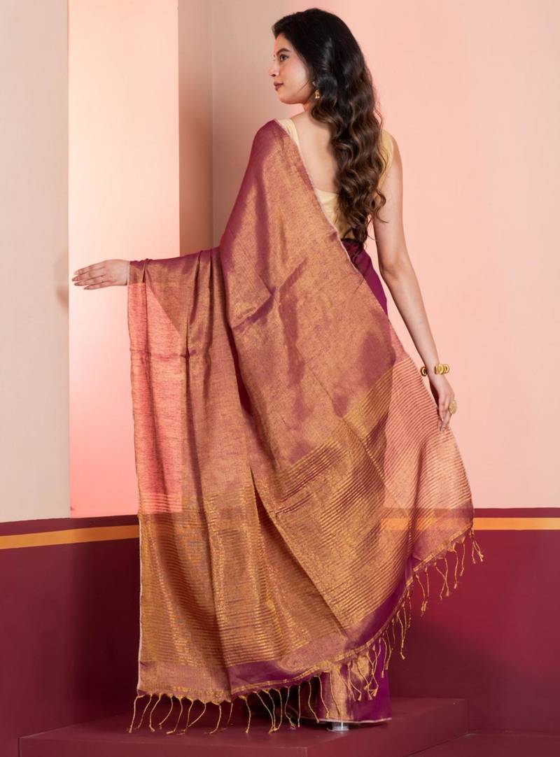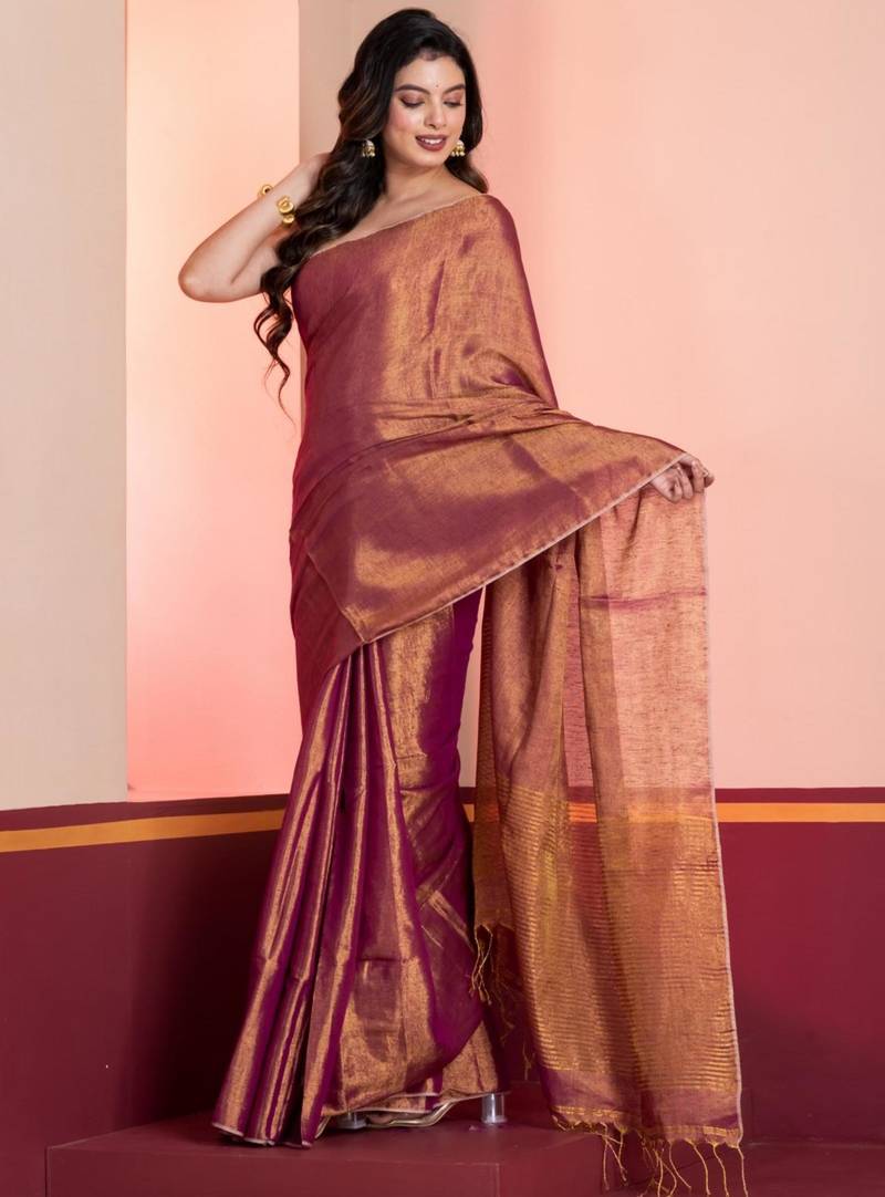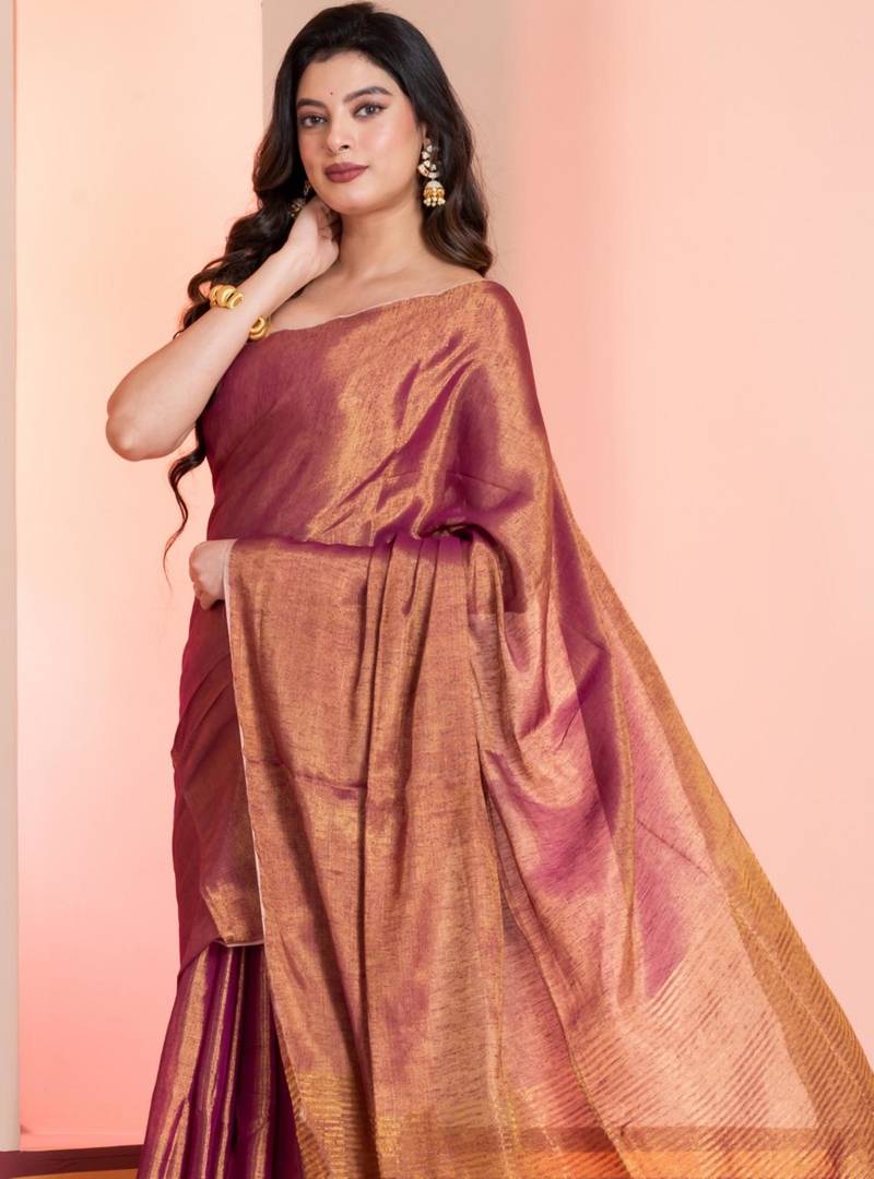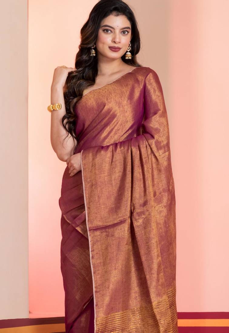 Product Name | Purple Golden Dual Tone Linen Tissue Saree With Zari, With Blouse | |