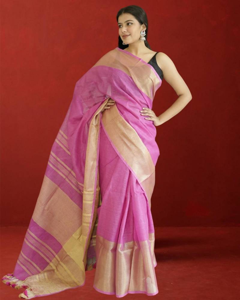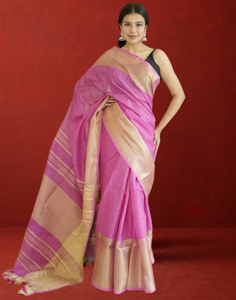 Product Name Pink Tissue Linen Saree With Zari Border