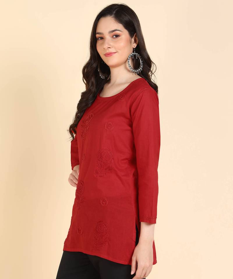 Vahson women floral rose chikankari short cotton a-line red kurti