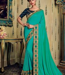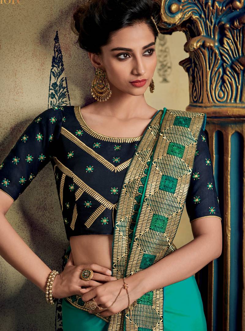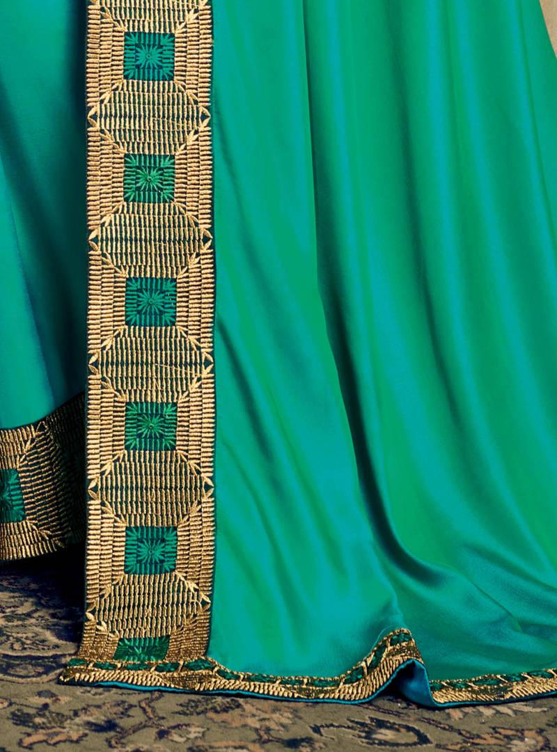 | Product Description | Designer Silk Embroidered Saree In Bright Firozi Decorated With Abstract Geometric Design Enriched With Heavy Gold Zari And Thread Incorporated With Double Border Look