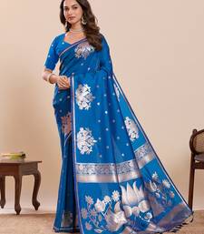 Authentic blue paithani soft silk blend saree for women with unstiched blouse piece