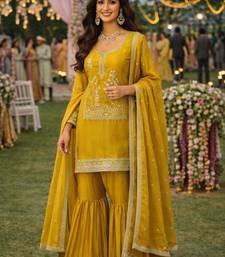 Elegant mustard embroidered real silk kurta sharara set with dupatta stitched