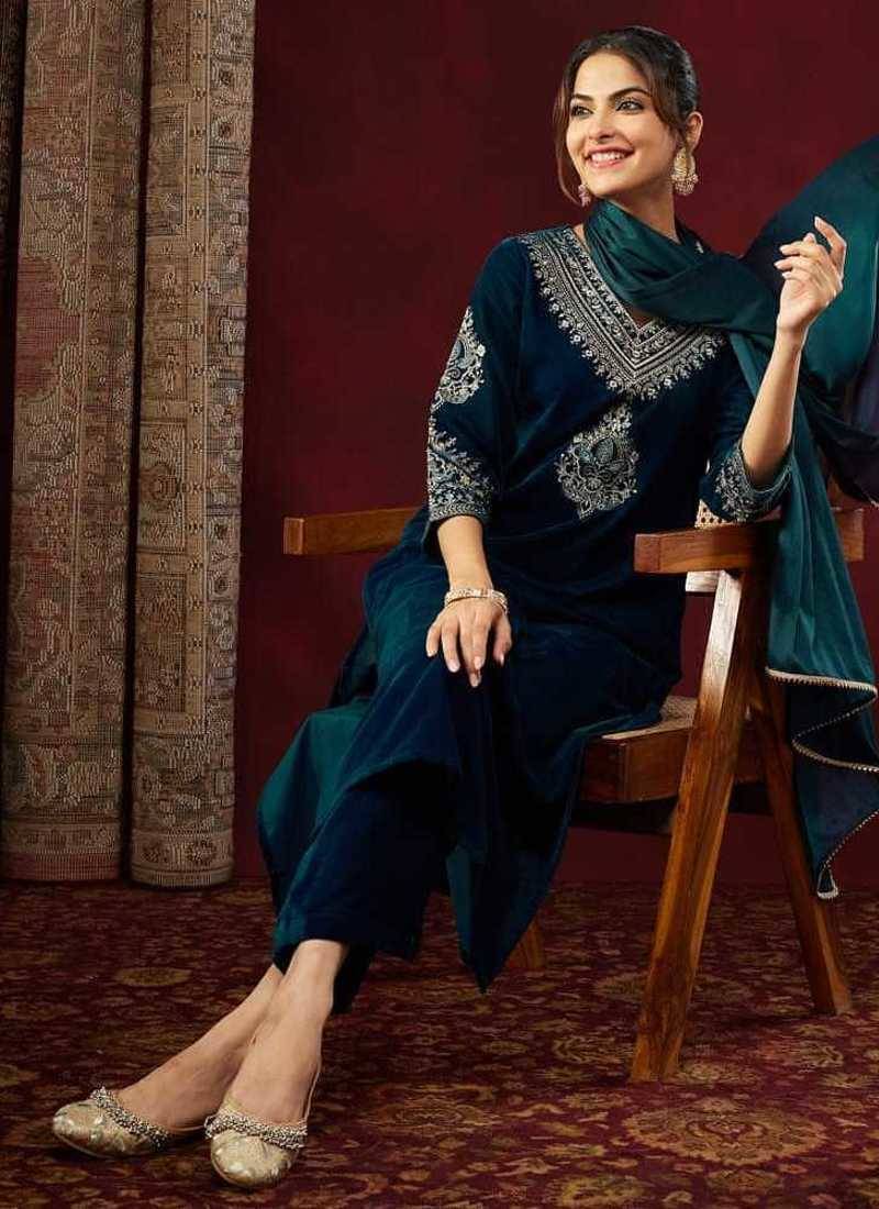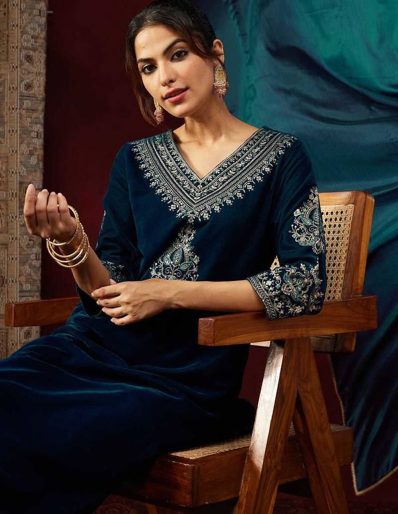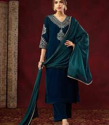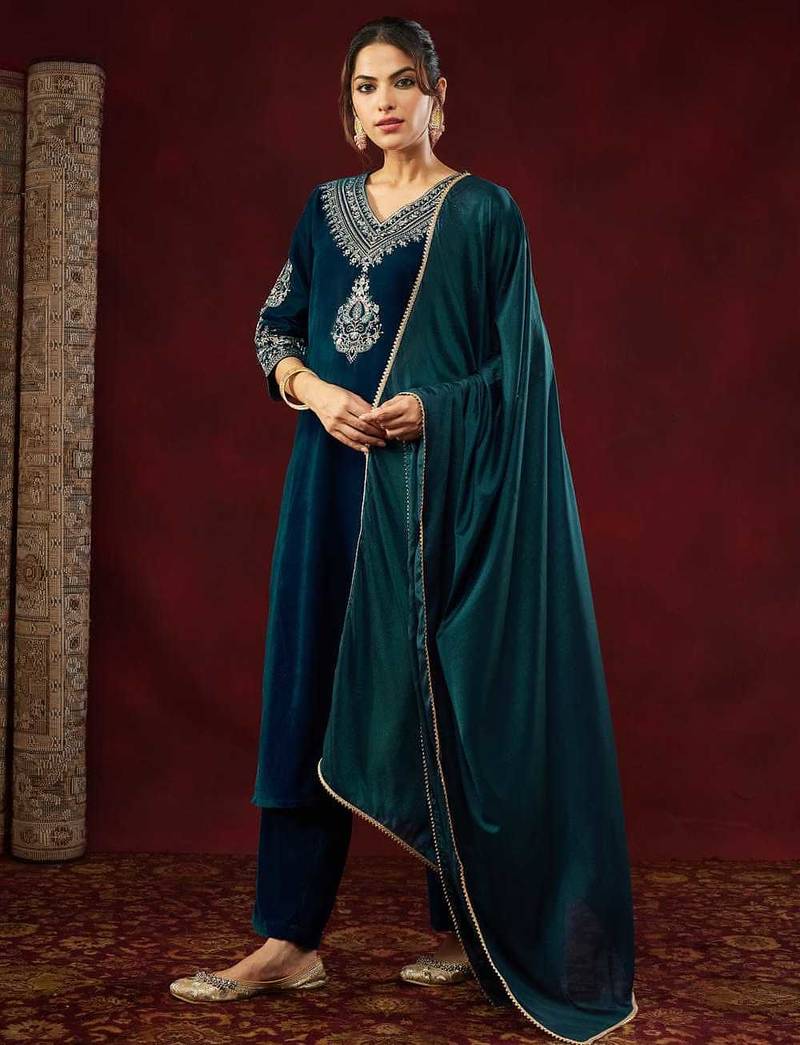 Stylish heavy velvet embroidered teal blue kurta set with dupatta & pant