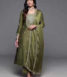 Stylish olive green viscose embroidered kurta set with dupatta & pant