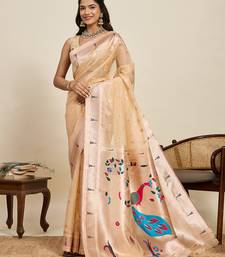 Traditional peach soft silk blend paithani saree with unstiched blouse piece