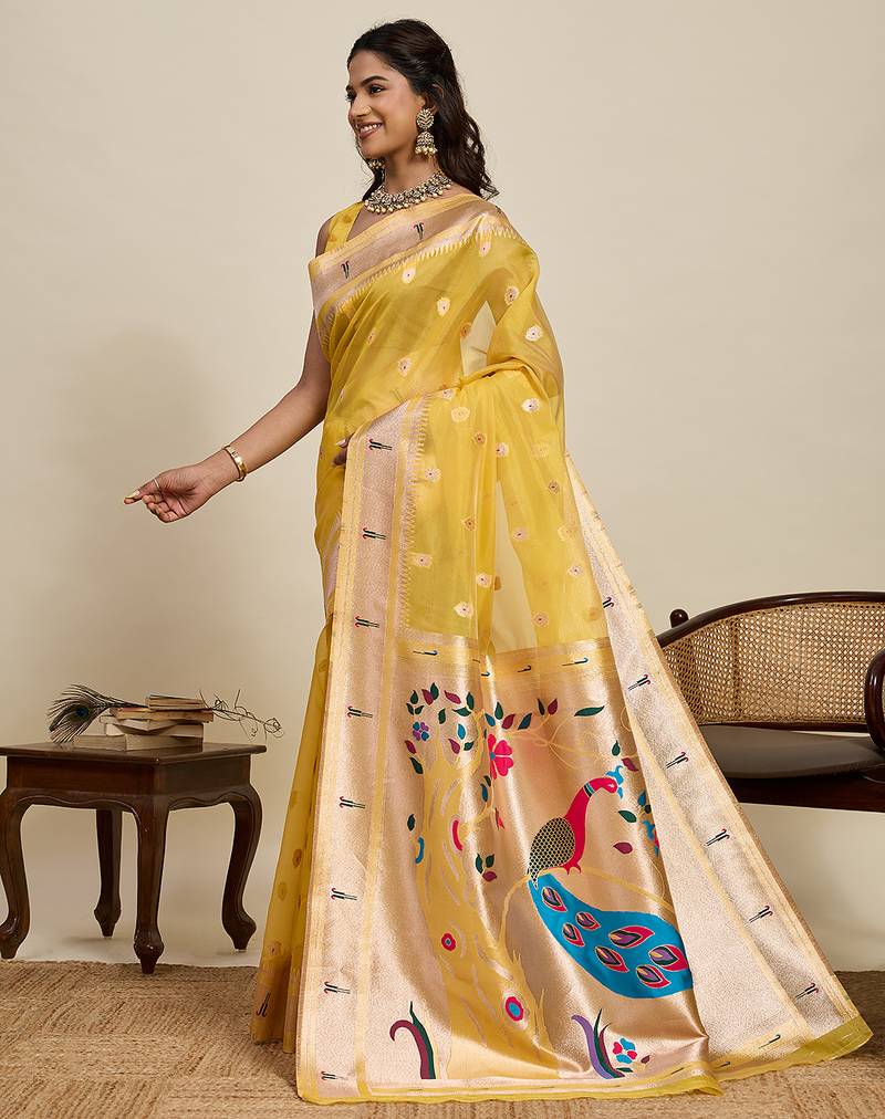 Traditional yellow soft silk blend paithani saree with unstiched blouse piece