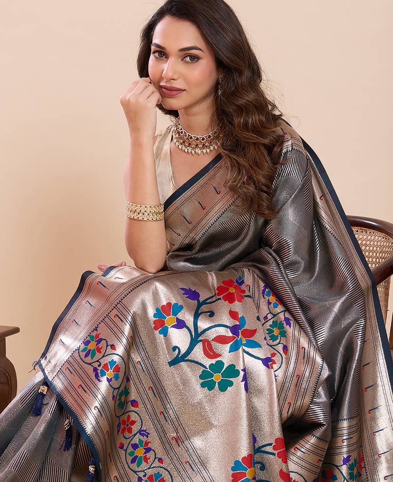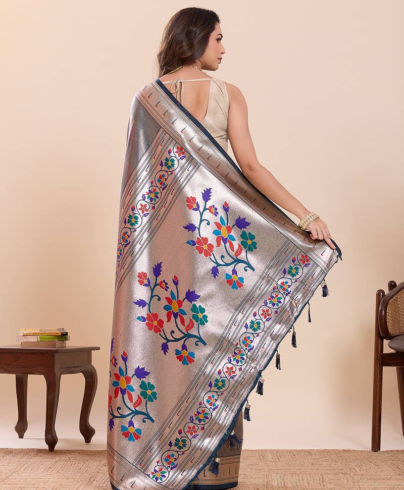 Women's flower paithani teal soft silk blend saree with zari weaving & rich floral motifs