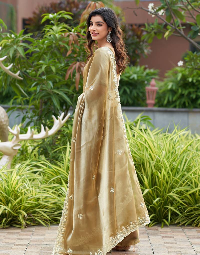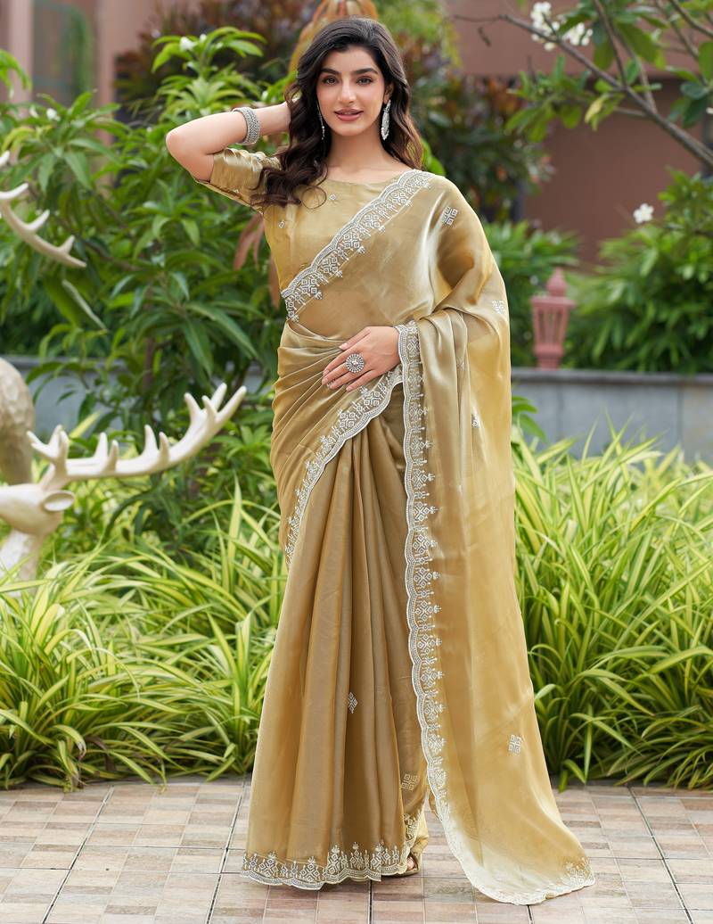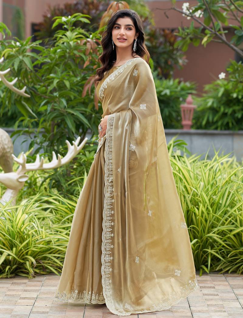 Beige embroidered shimmer chiffon bollywood saree with blouse