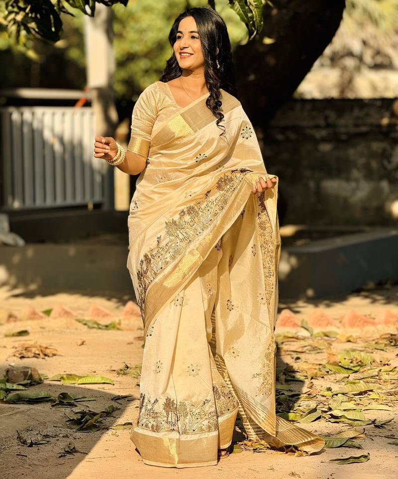 Beige embroidery tussar silk saree with blouse