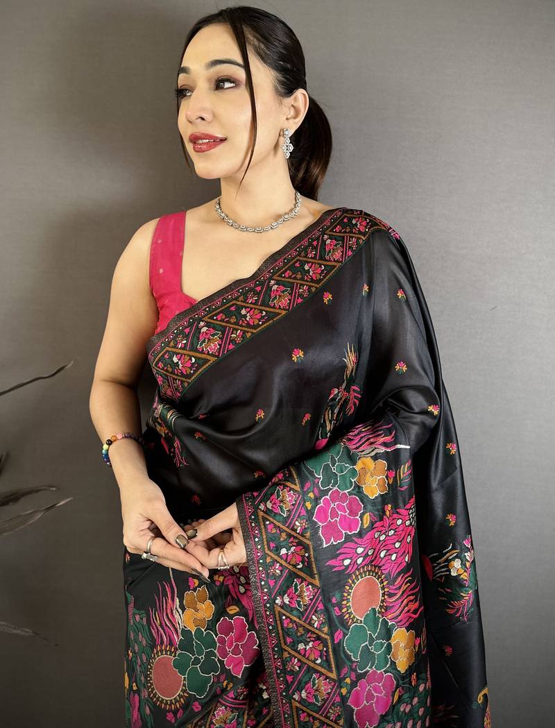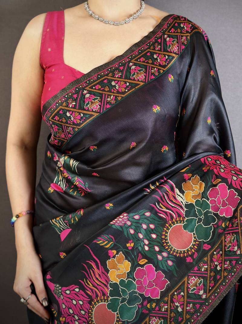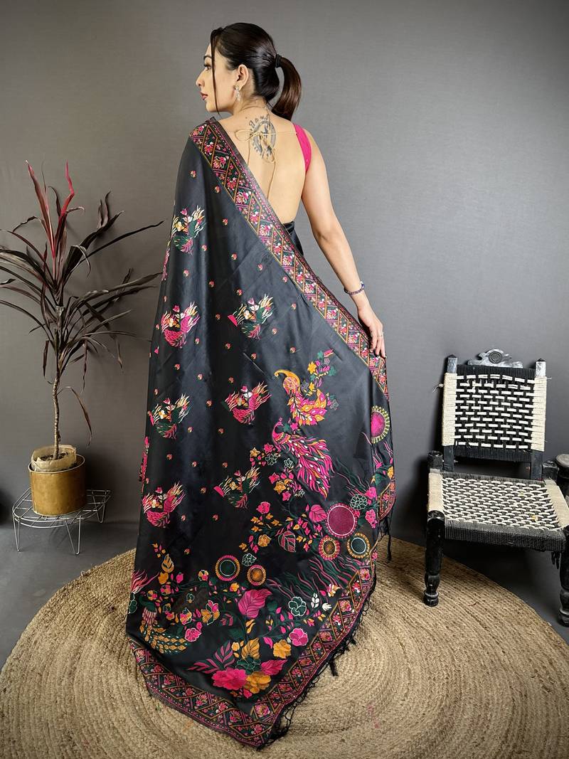 Black peacock, floral pashmina silk saree with blouse