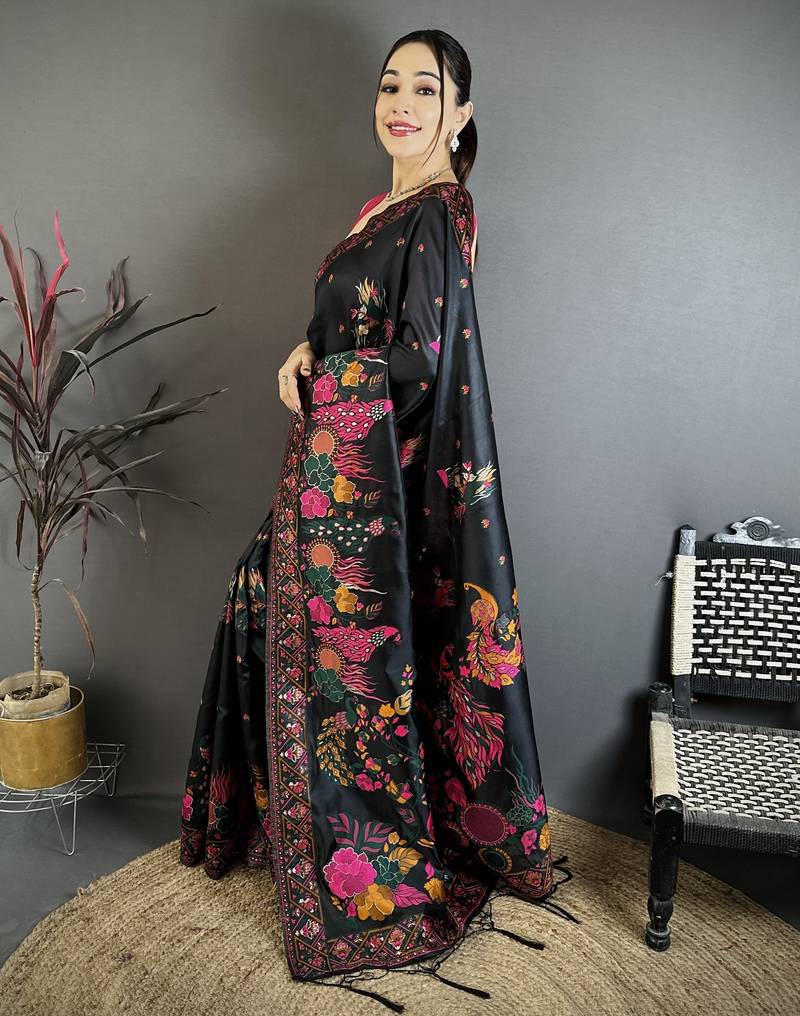 | Product Name | Black Peacock, Floral Pashmina Silk Saree With Blouse | |