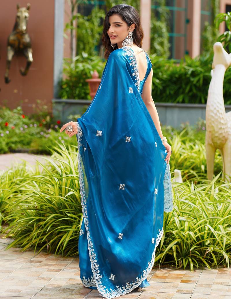 Blue embroidered shimmer chiffon bollywood saree with blouse