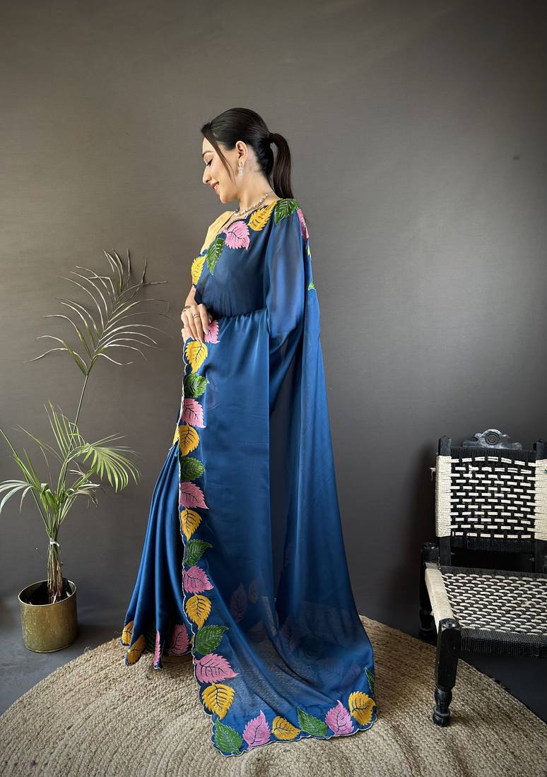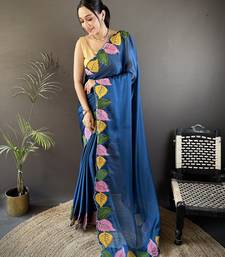 Blue floral emboidery, solid rangoli silk saree with blouse