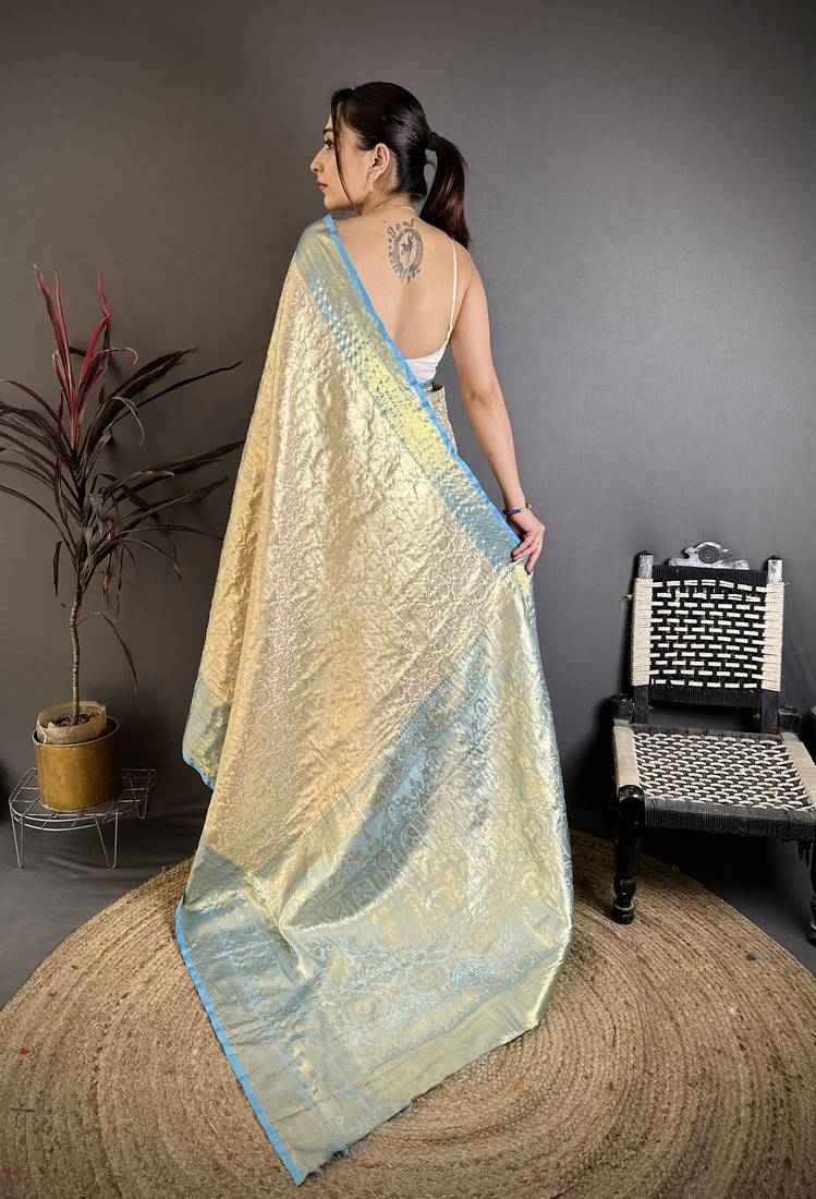 Blue floral, zari woven kanchipuram silk saree with blouse