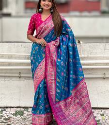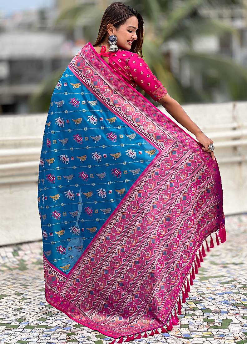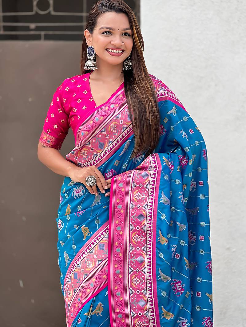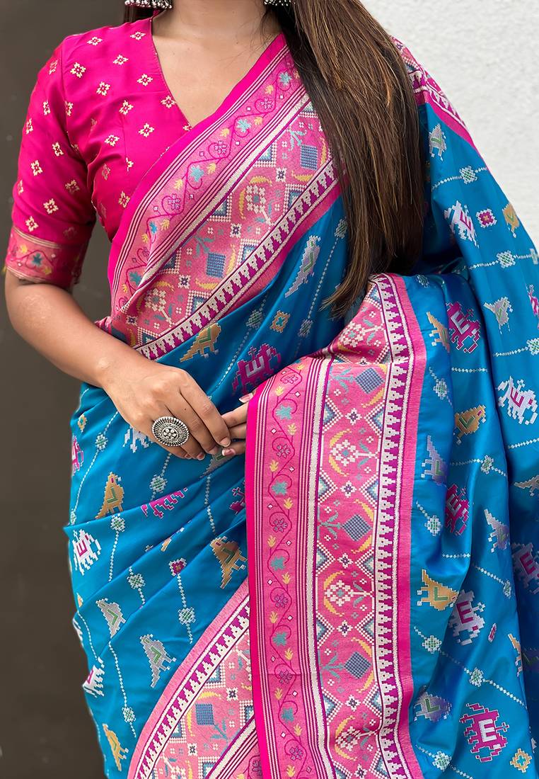 Blue woven self design silk blend patola saree with blouse
