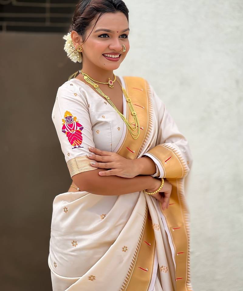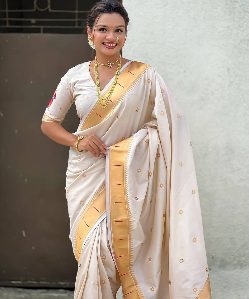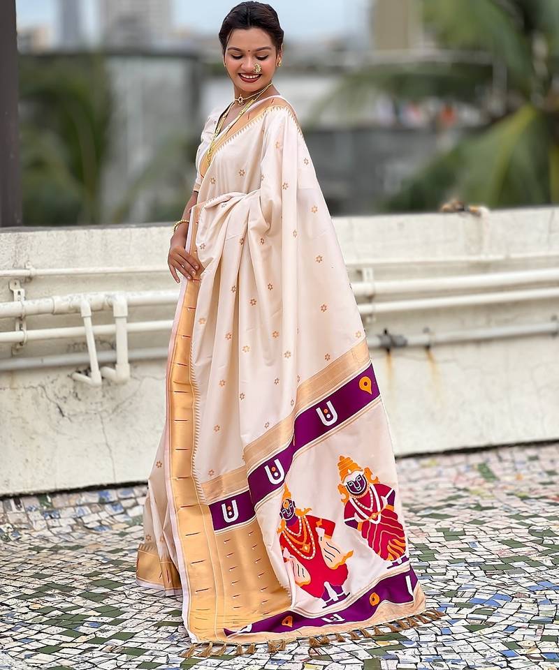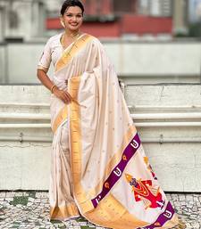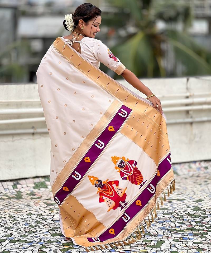 Cream woven self design pure silk paithani saree with blouse