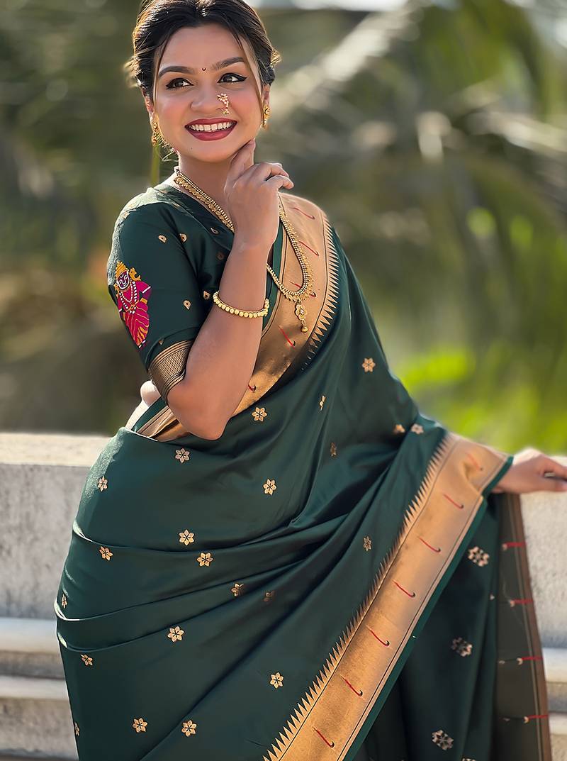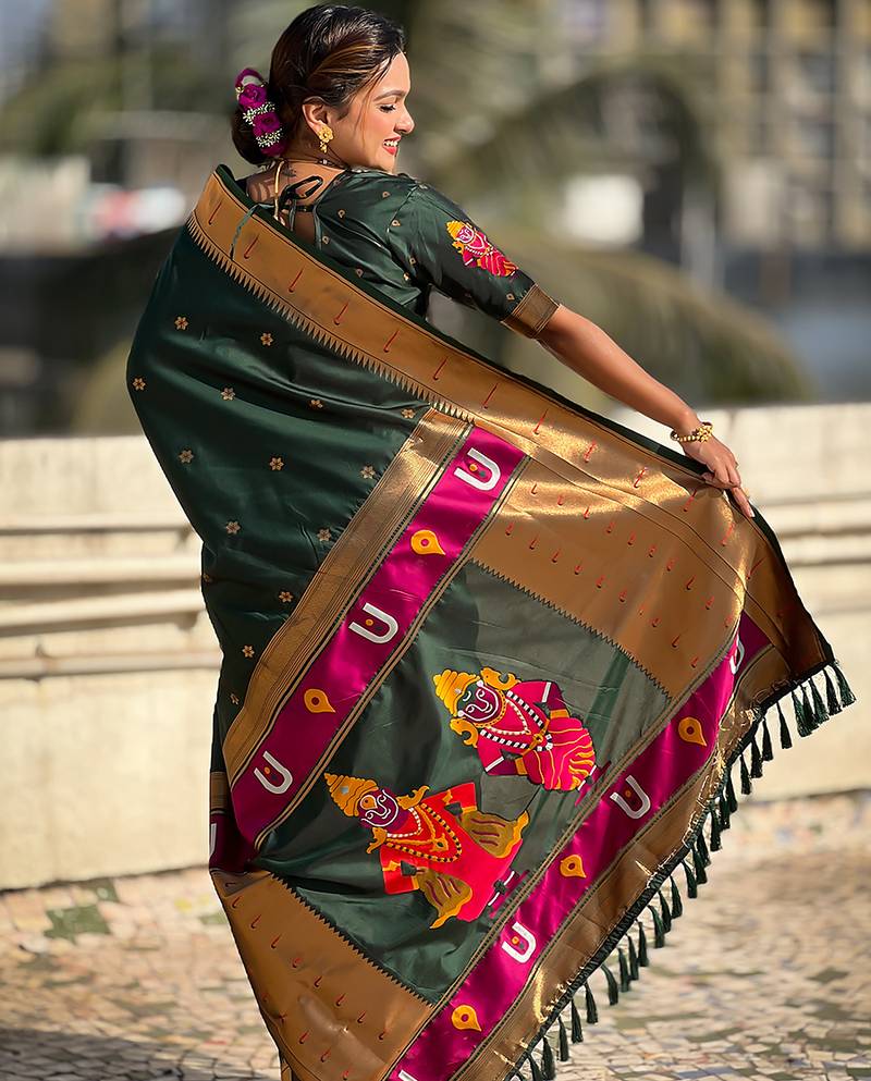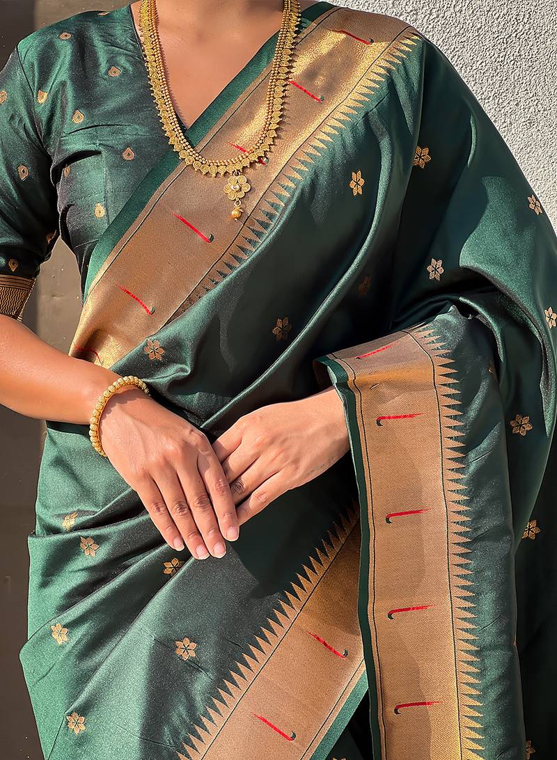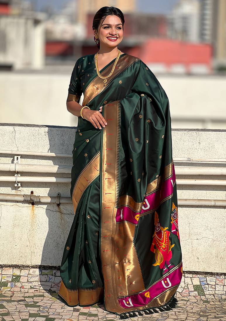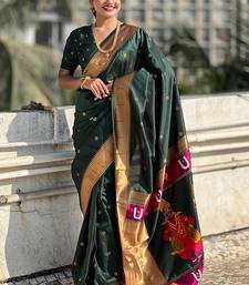 Dark green woven self design pure silk paithani saree with blouse