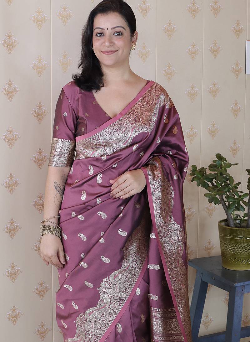Dark mauve woven self design pure silk banarasi saree with blouse