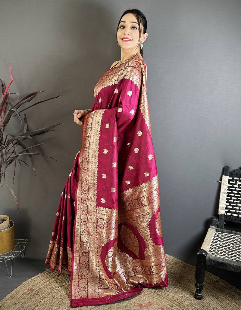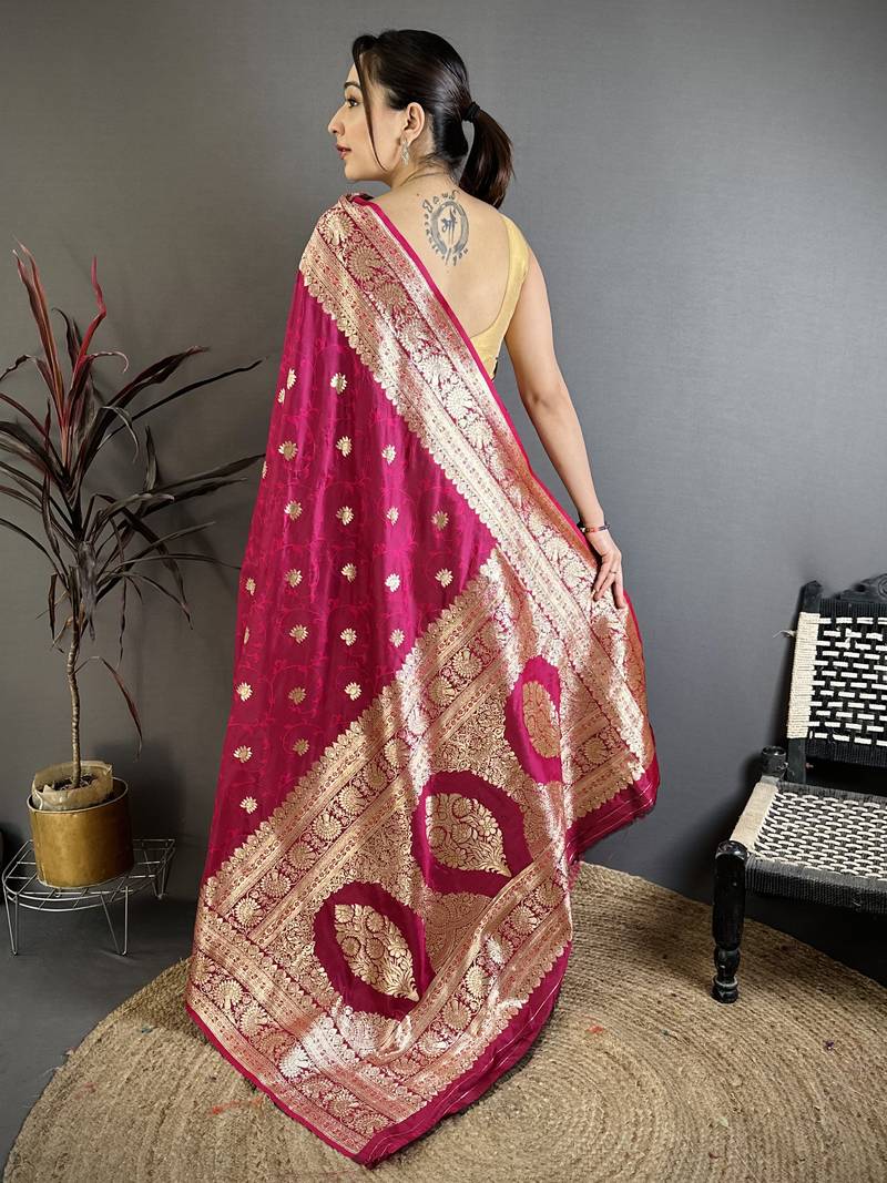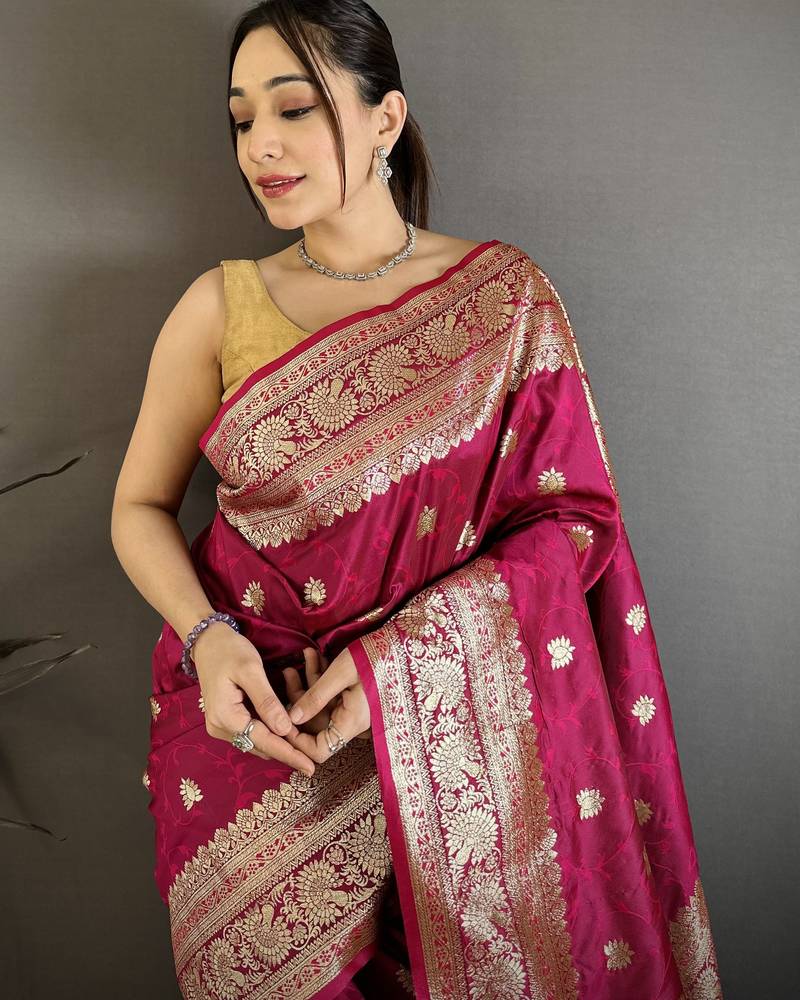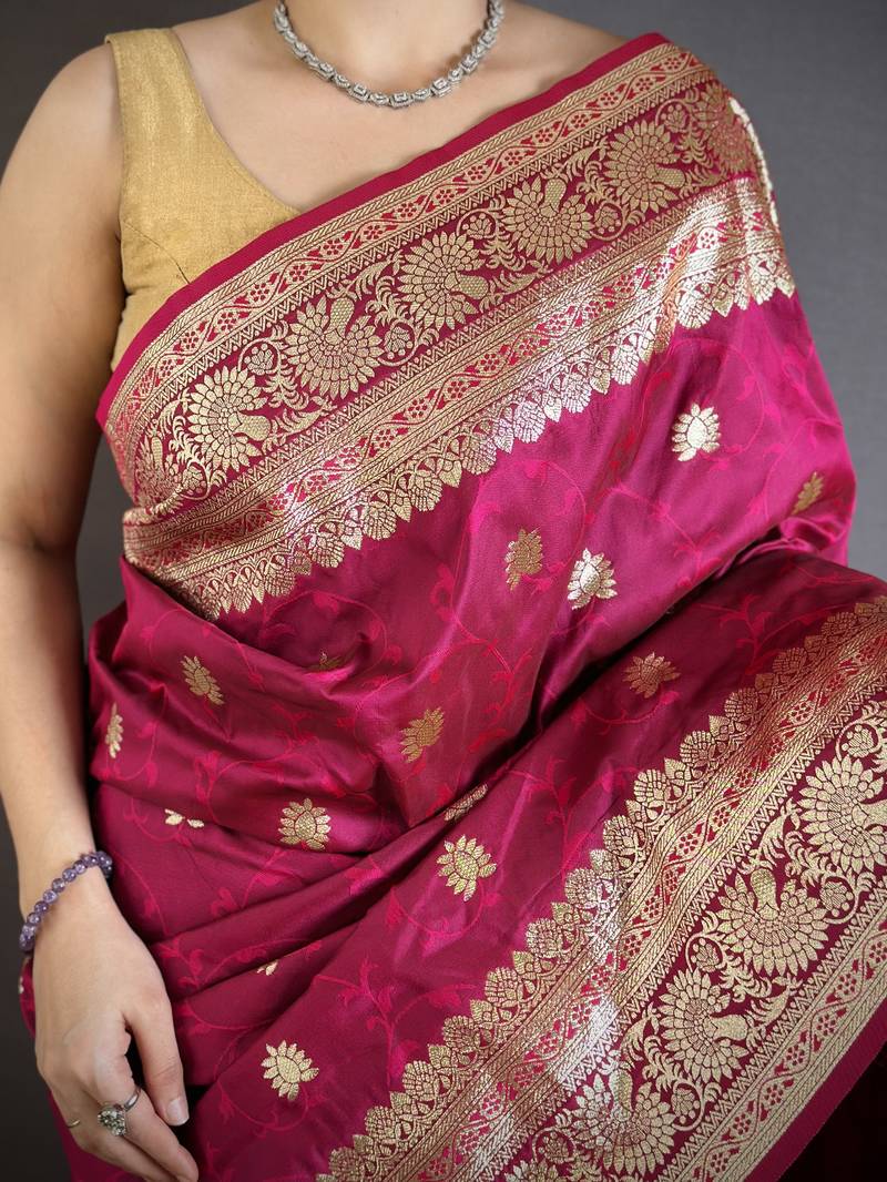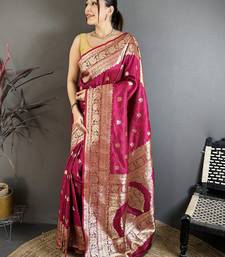 Dark pink floral, zari woven banarasi silk saree with blouse