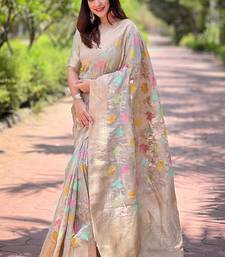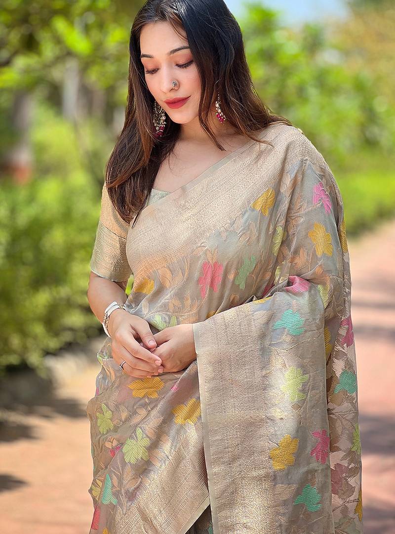 Grey woven embellished organza kanjivaram saree with blouse