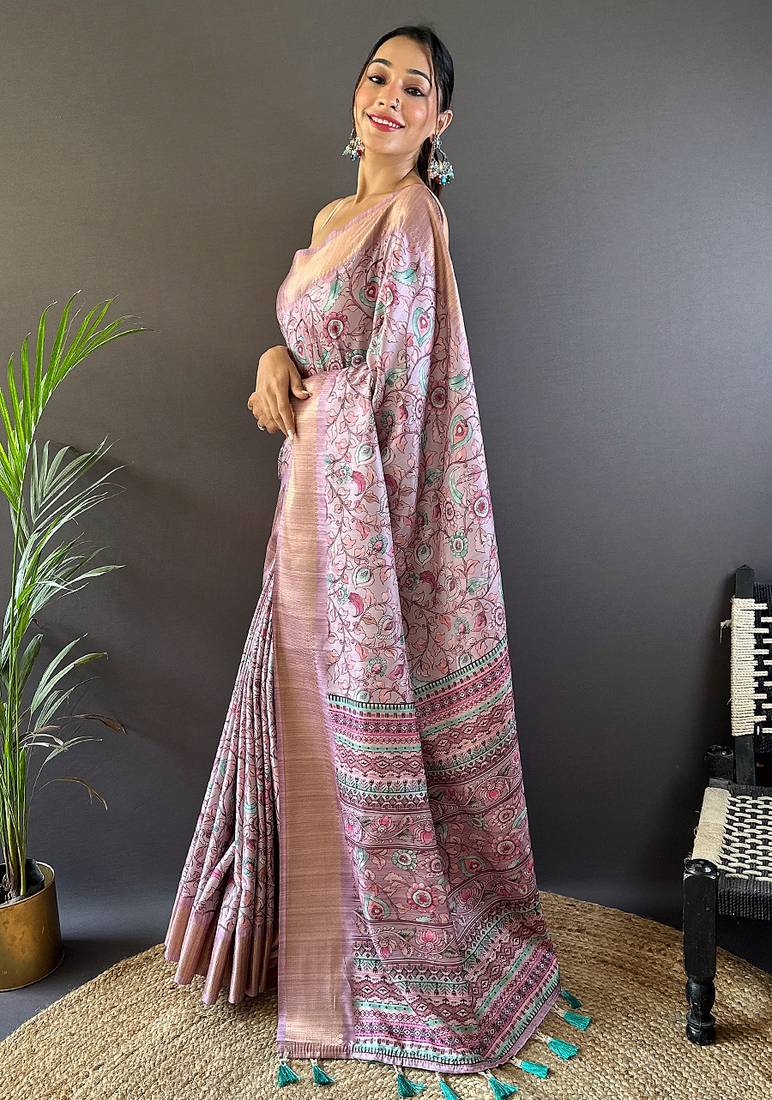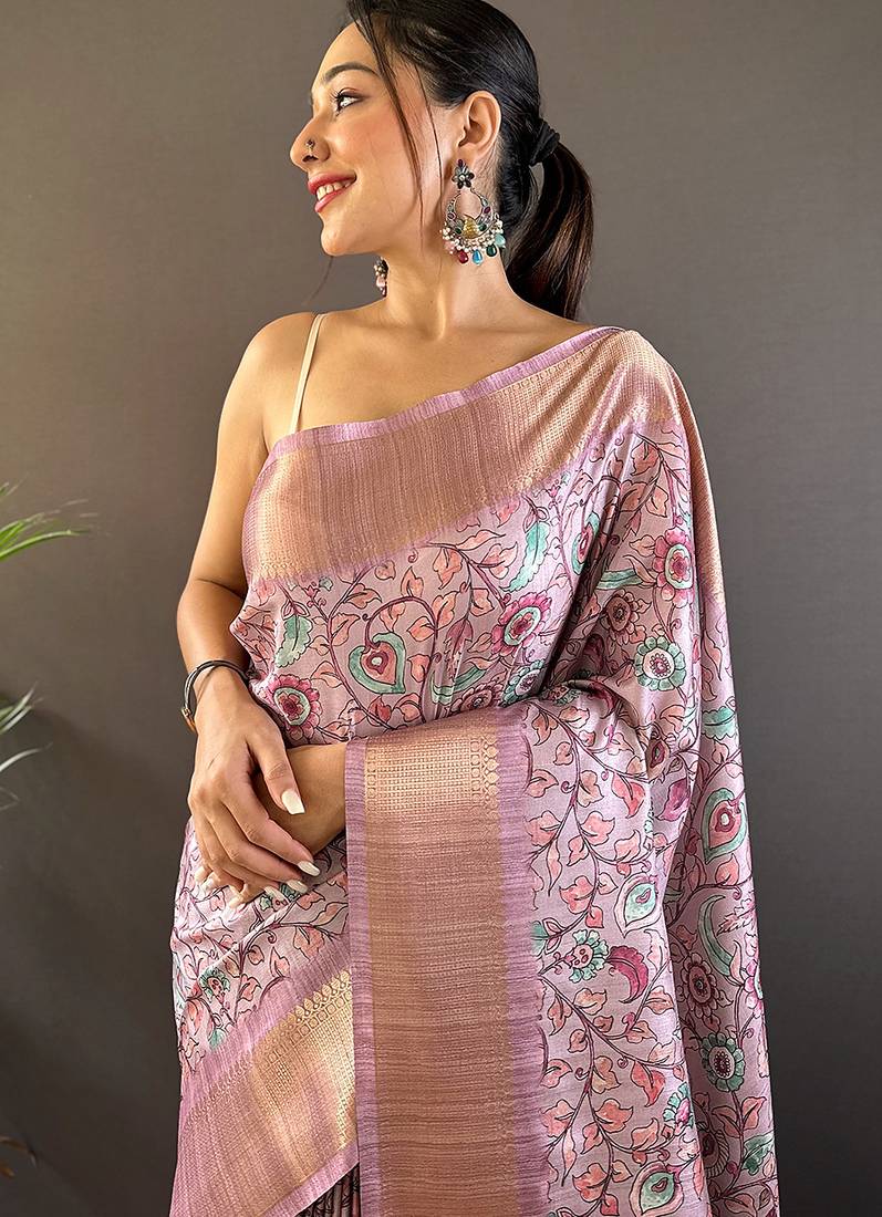 | Product Description | Soft Assam Silk Sarees With Kalamkari Prints All Over The Body Having Zari Woven Border On Both Sides Rich Kalamkari Digitally Printed Pallu. Paired With Printed Blouse. |