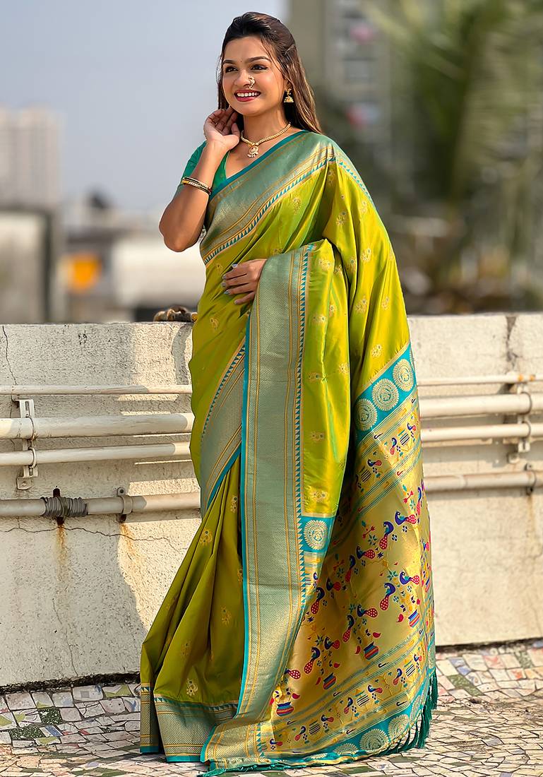 Mehendi woven self design pure silk paithani saree with blouse
