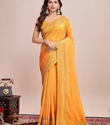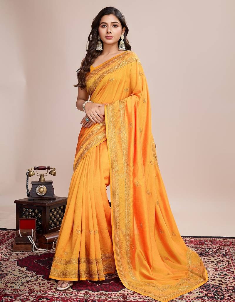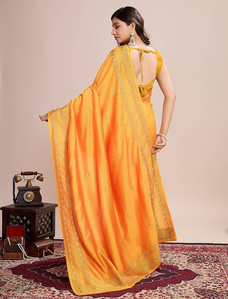 Mustard embroidered silk blend bollywood saree with blouse