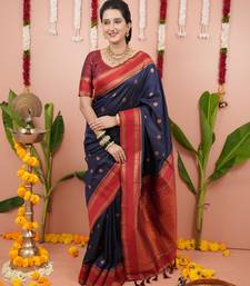 Navy blue floral, zari work soft silk saree with blouse