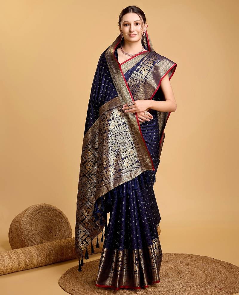 | Product Name | Navy Blue Woven Embellished Self Design Pure Silk Banarasi Saree With Blouse | |