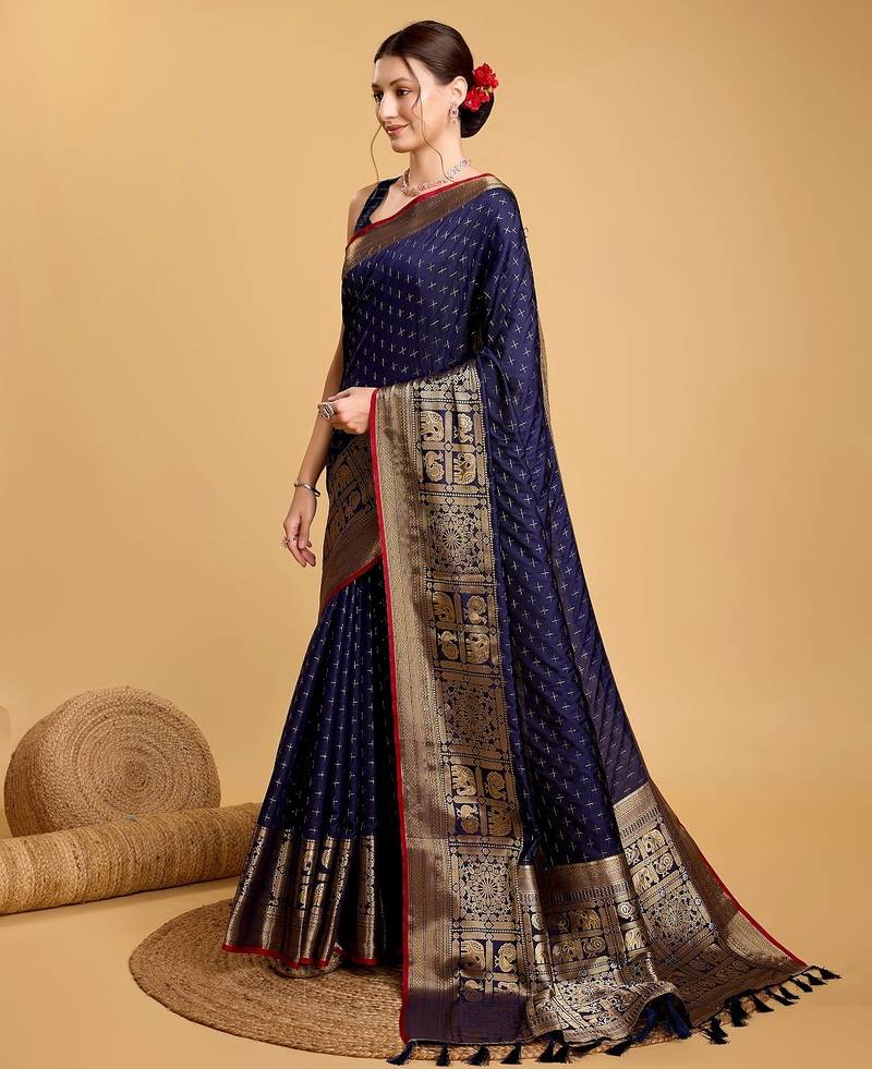 Navy blue woven embellished self design pure silk banarasi saree with blouse