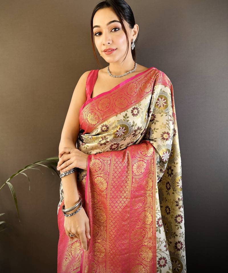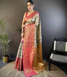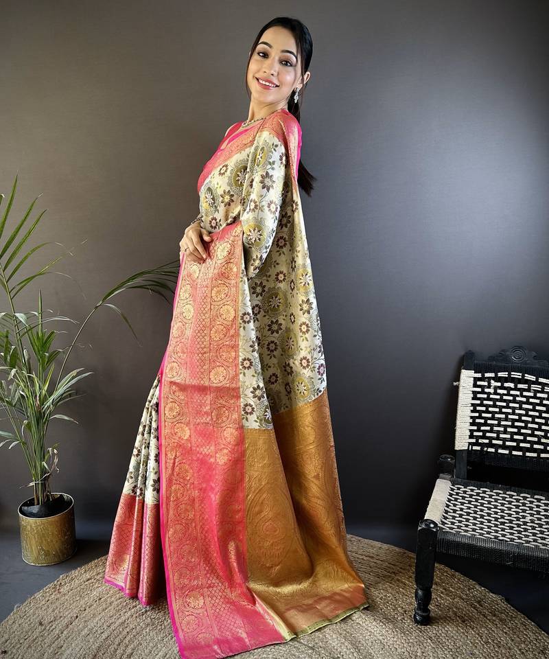 Off white, pink floral, zari woven kanjivaram tissue silk saree with blouse