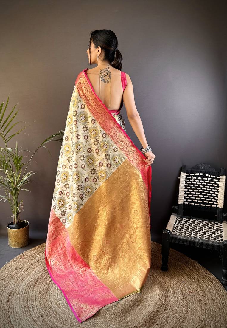 | Product Name | Off White, Pink Floral, Zari Woven Kanjivaram Tissue Silk Saree With Blouse | |