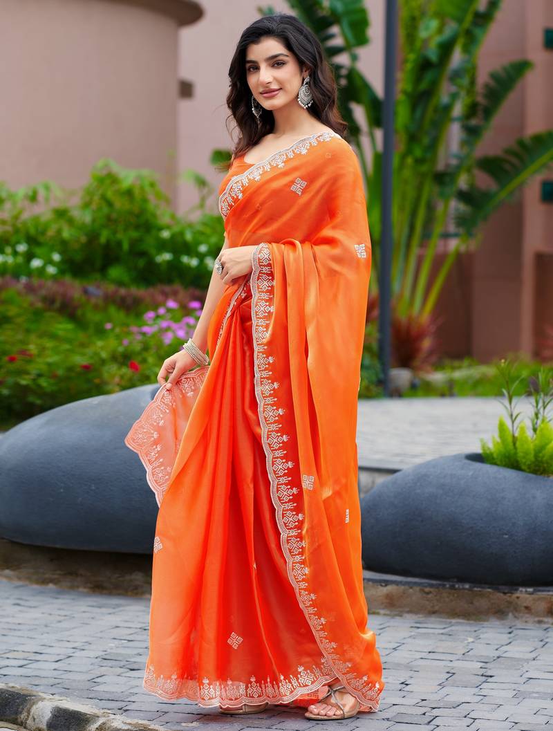 | Product Name | Orange Embroidered Shimmer Chiffon Bollywood Saree With Blouse | |