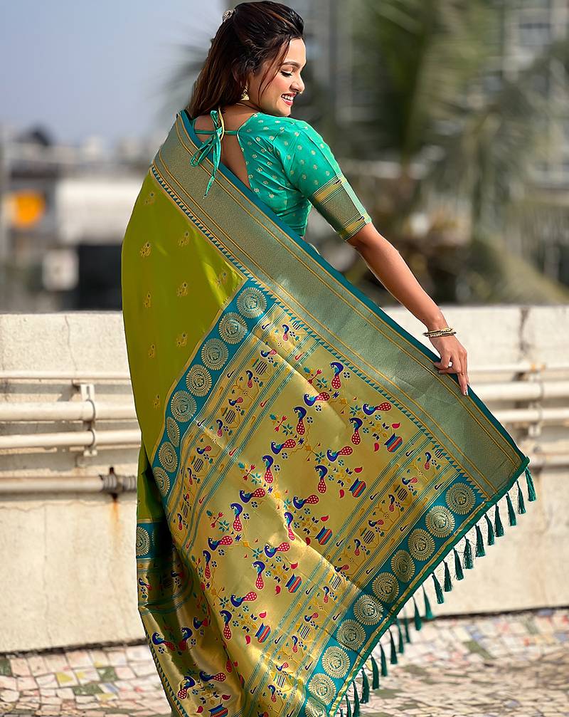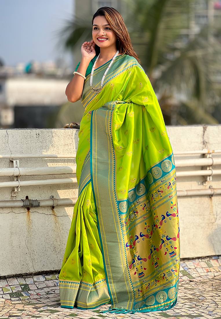 Parrot green woven self design pure silk paithani saree with blouse