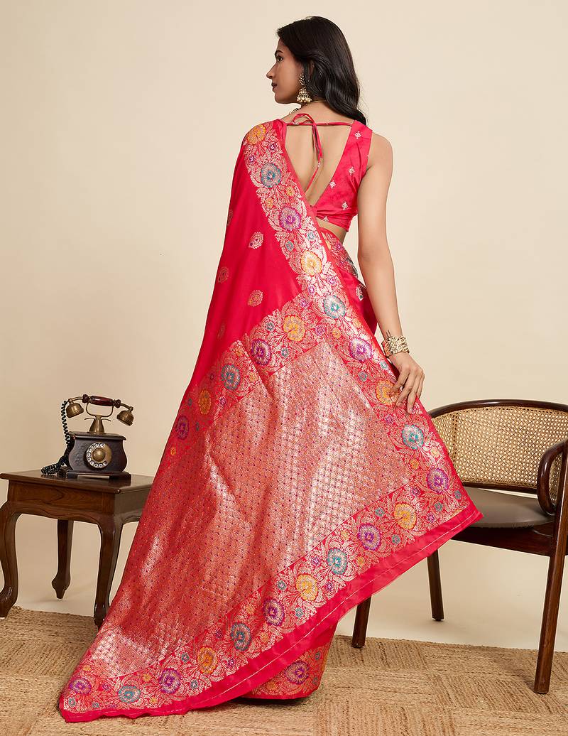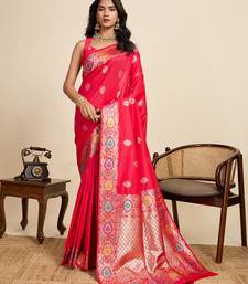 Pink floral print woven pure jacquard banarasi saree with blouse