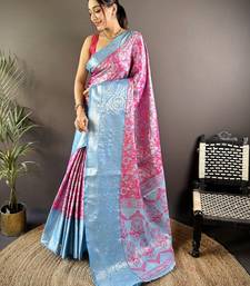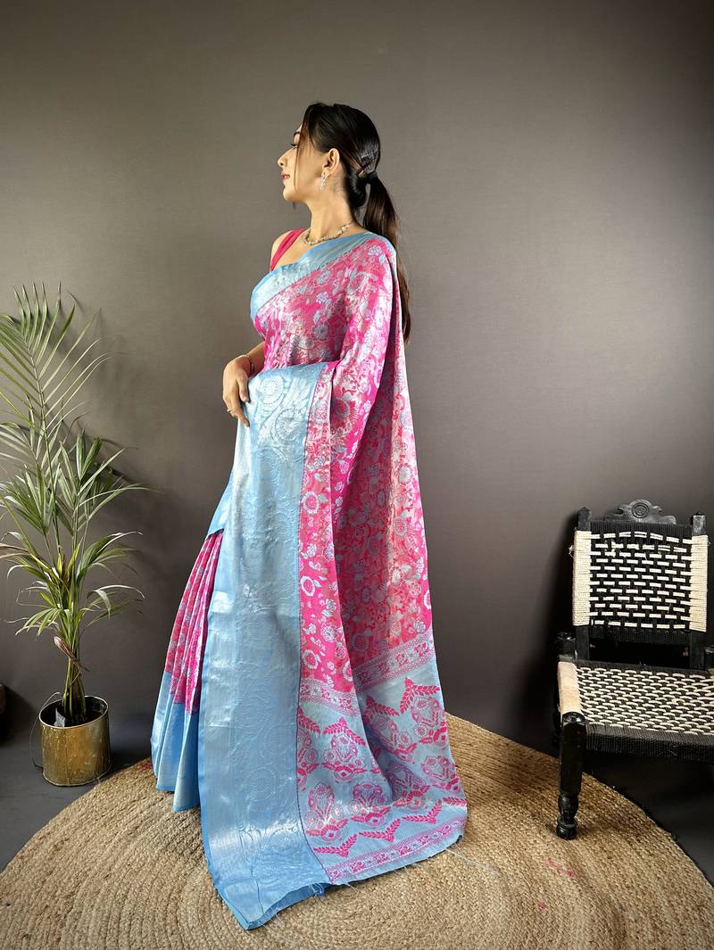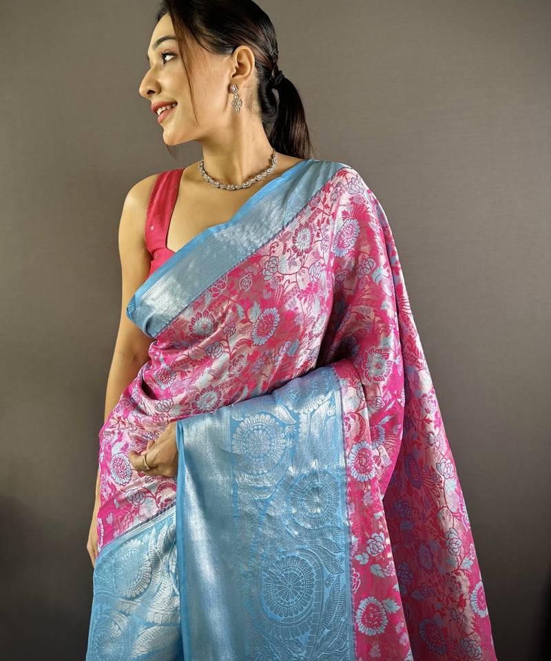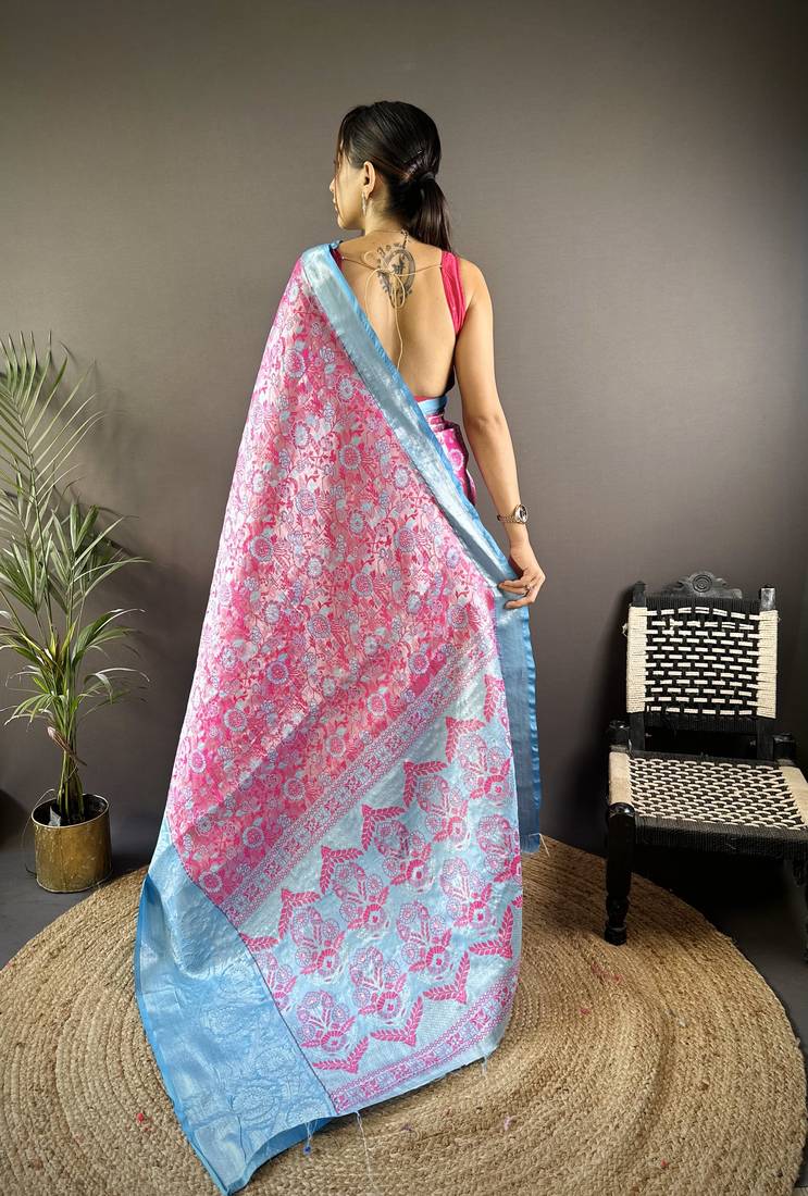 Pink floral, zari woven kanjivaram tissue silk saree with blouse