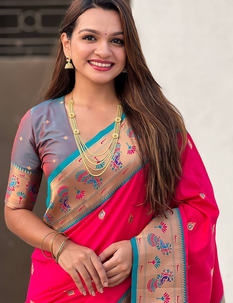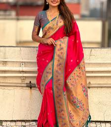 Pink woven self design pure silk paithani saree with blouse