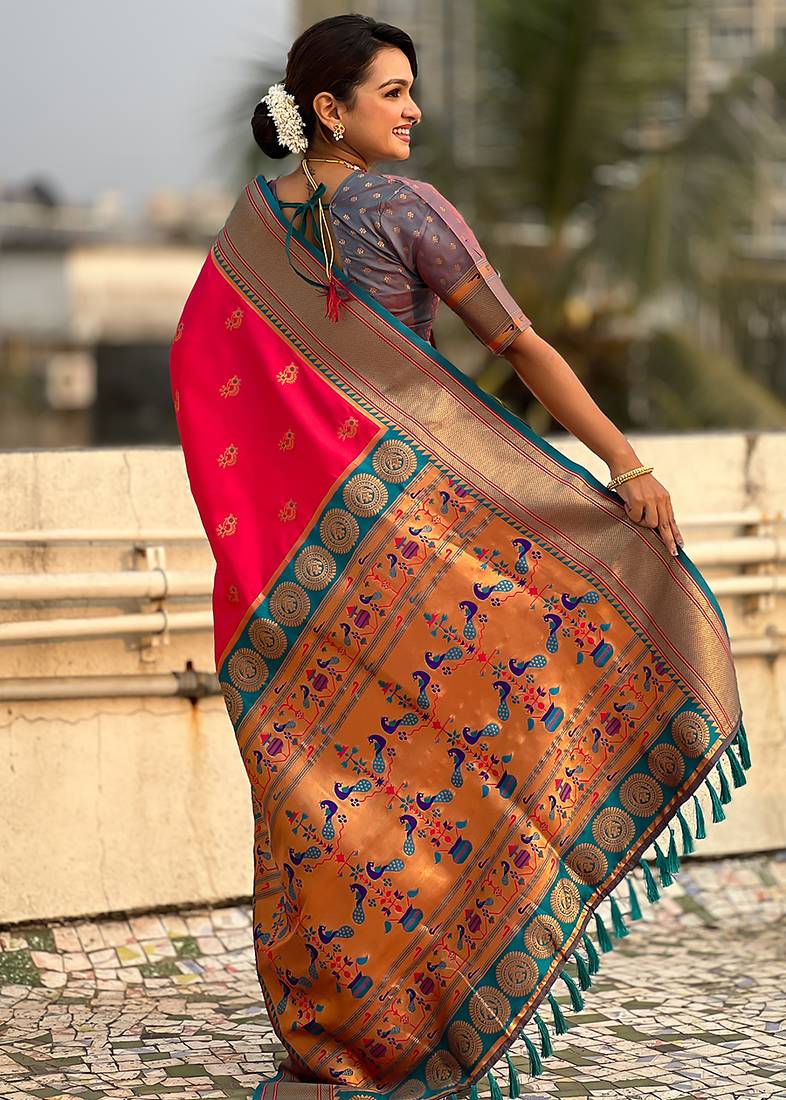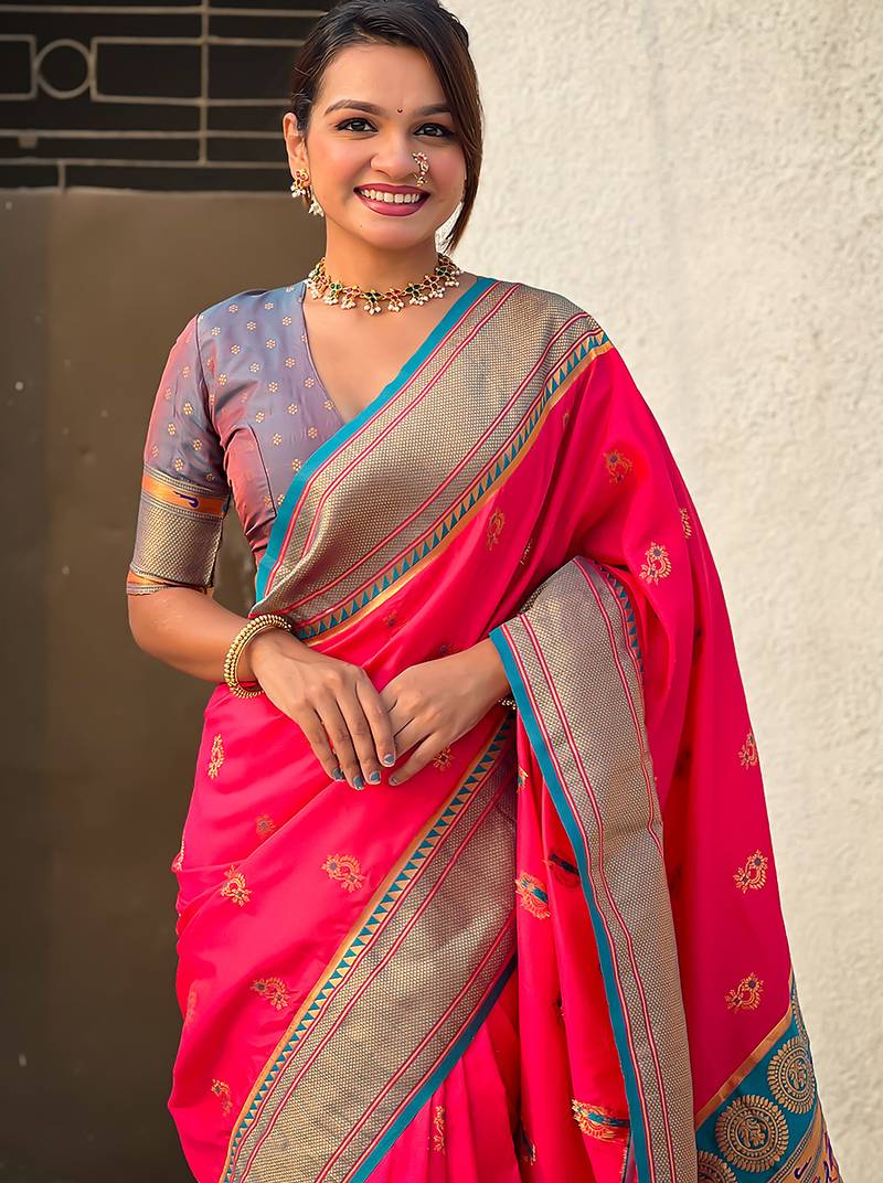 Pink woven self design pure silk paithani saree with blouse