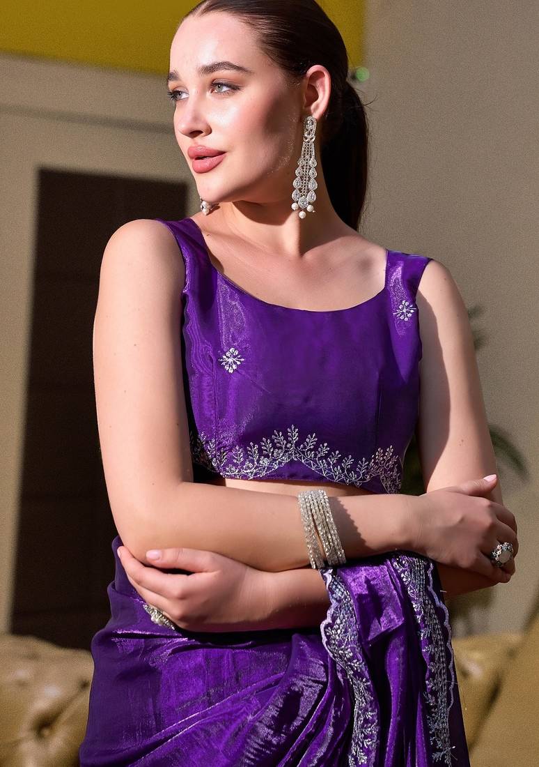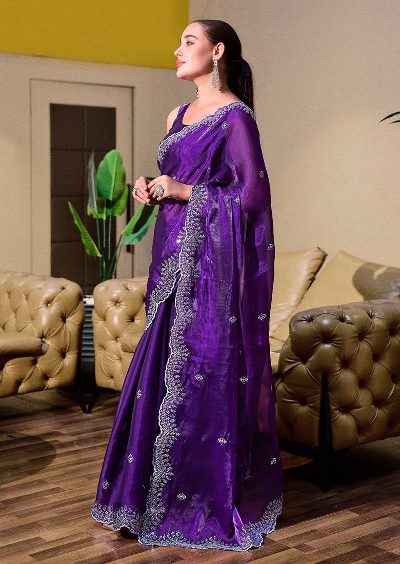 Purple embroidered embellished shimmer chiffon bollywood saree with blouse