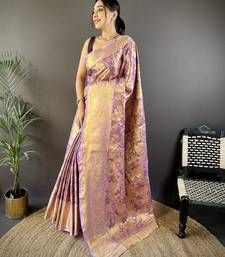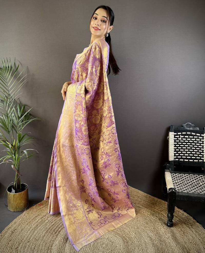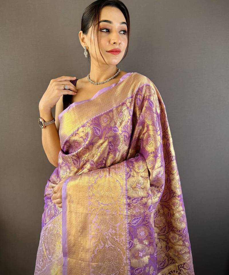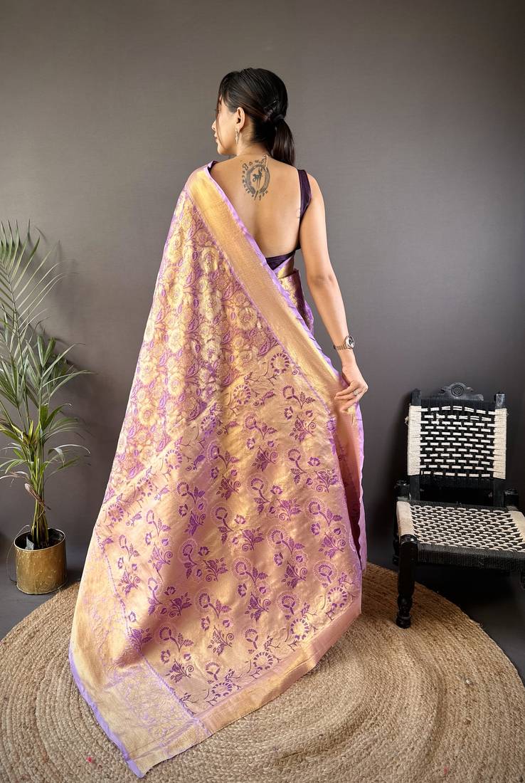Purple floral, zari woven kanjivaram tissue silk saree with blouse
