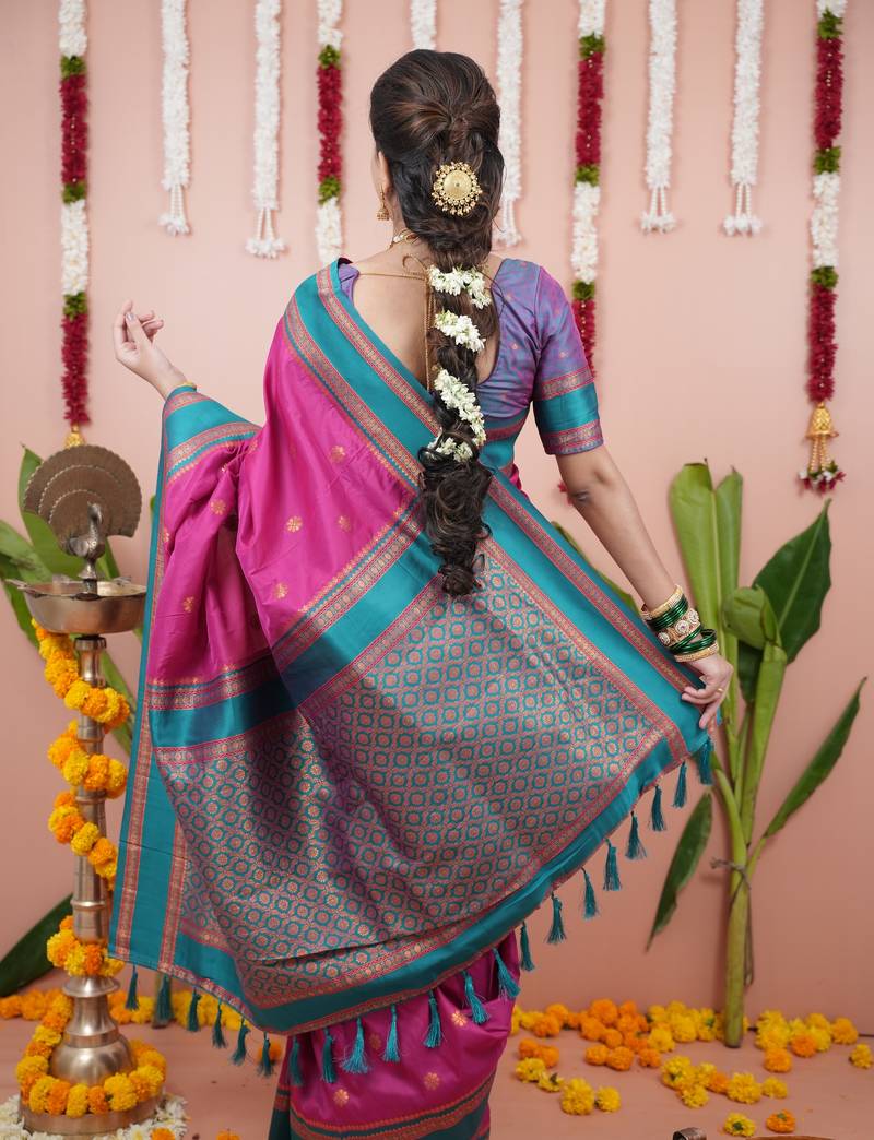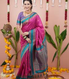 Rani pink floral, zari work soft silk saree with blouse