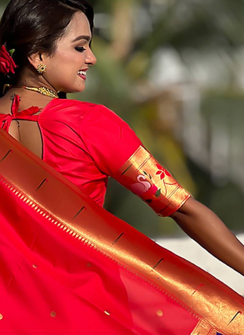 Red woven self design pure silk paithani saree with blouse