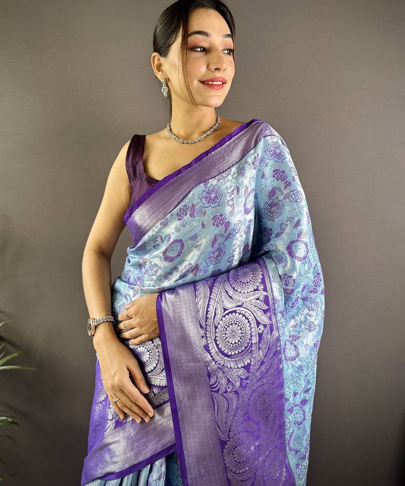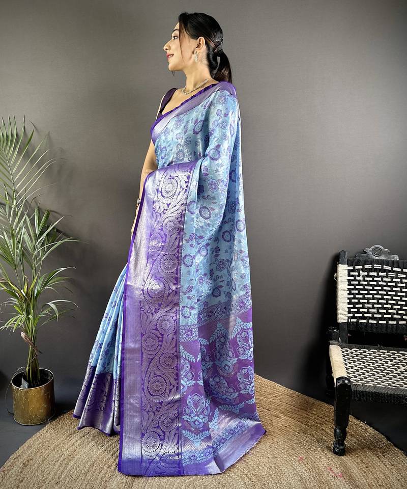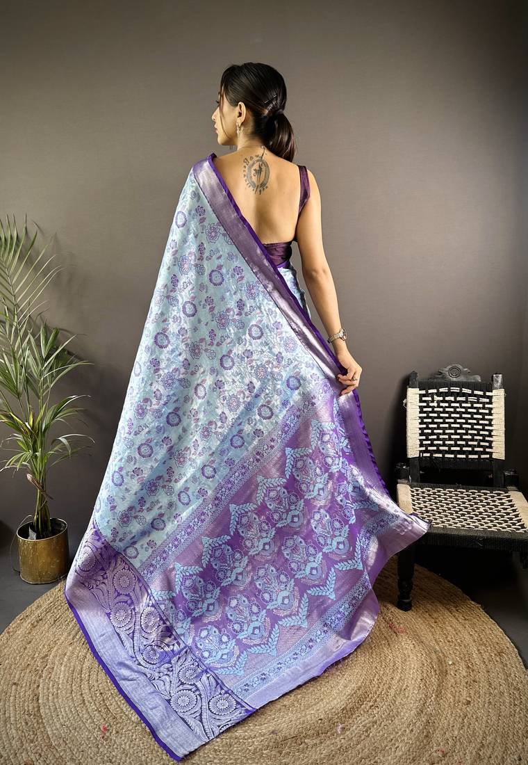 Sky blue floral, zari woven kanjivaram tissue silk saree with blouse