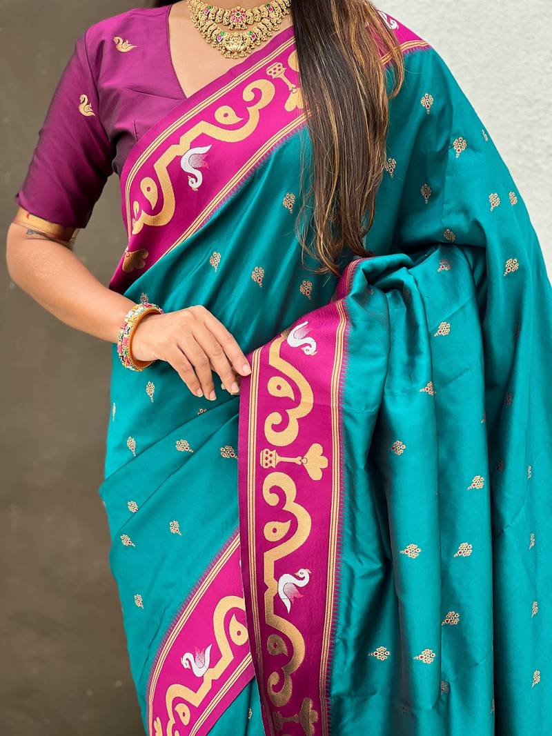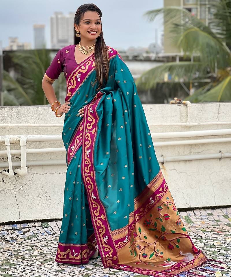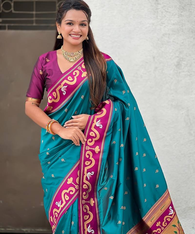 | Product Name | Teal Blue Magenta Woven Self Design Pure Silk Paithani Saree With Blouse | |