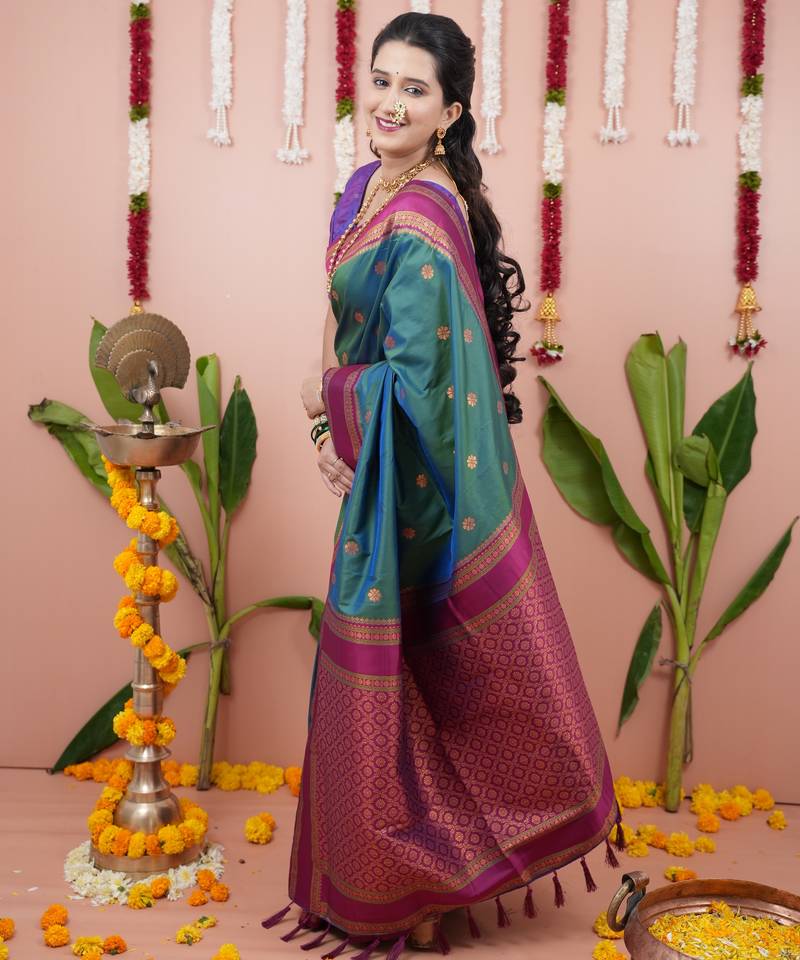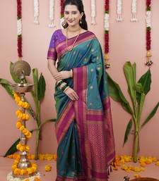Teal green floral, zari work soft silk saree with blouse